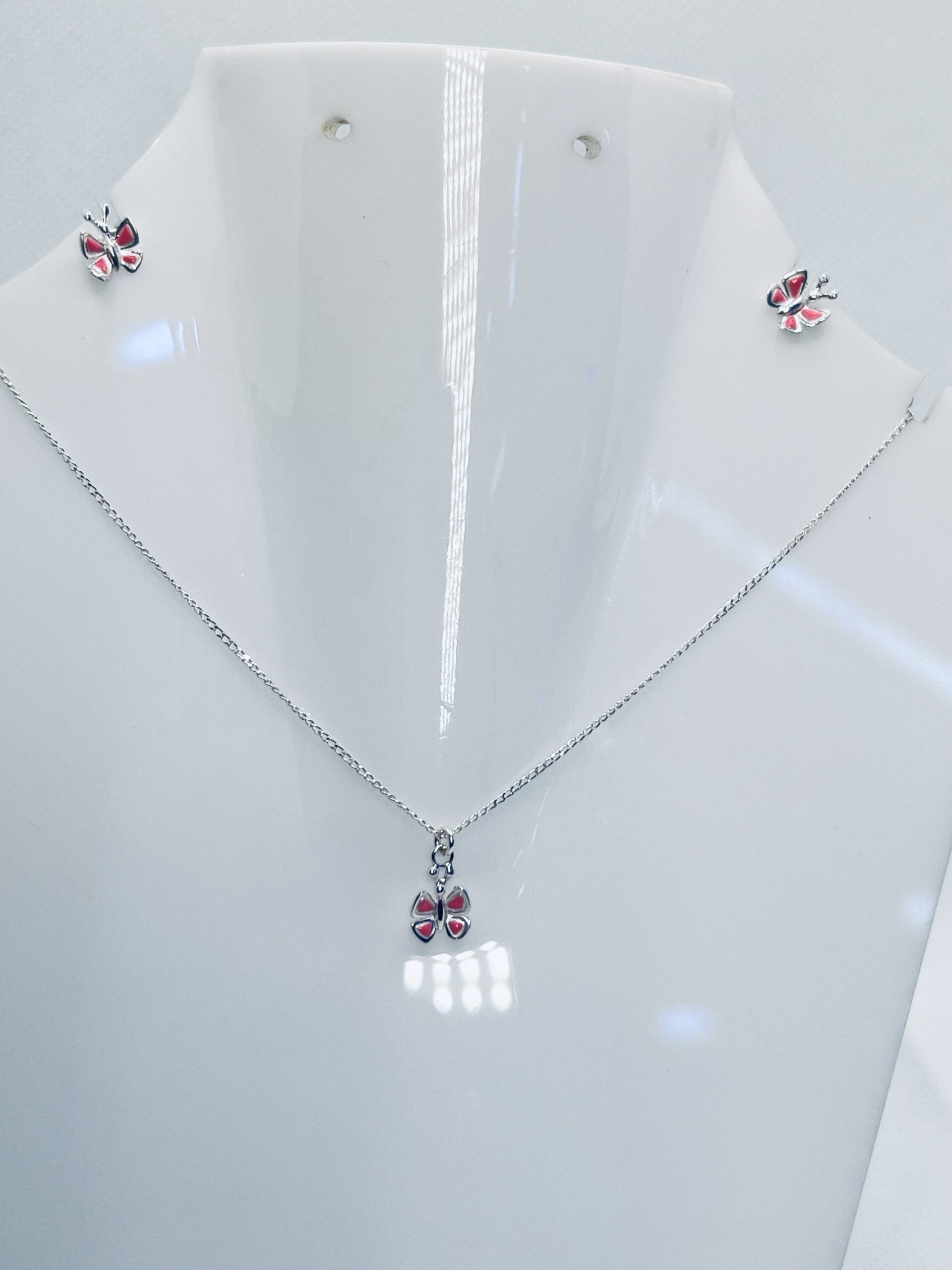 925 Sterling Silver Butterfly Necklace with Matching Earrings for Women Delicate and charming, this 925 sterling silver necklace set features a beautifully crafted butterfly pendant with vibrant enamel accents, paired with matching butterfly stud earrings. Lightweight and elegant, it adds a touch of color and grace to any outfit. Perfect for daily wear, parties, or as a thoughtful gift, this set symbolizes beauty, freedom, and transformation. A timeless piece for every woman’s jewelry collection.