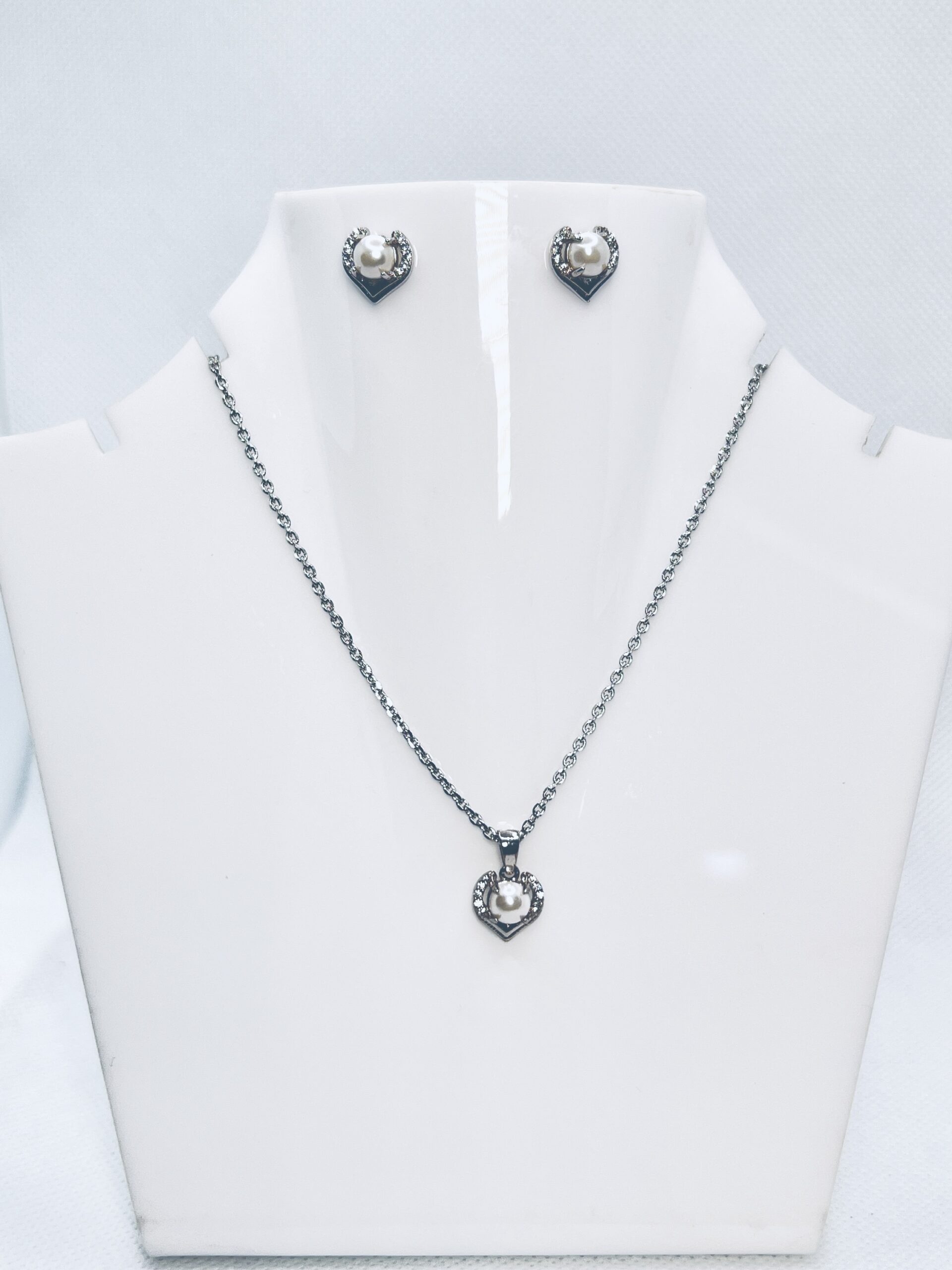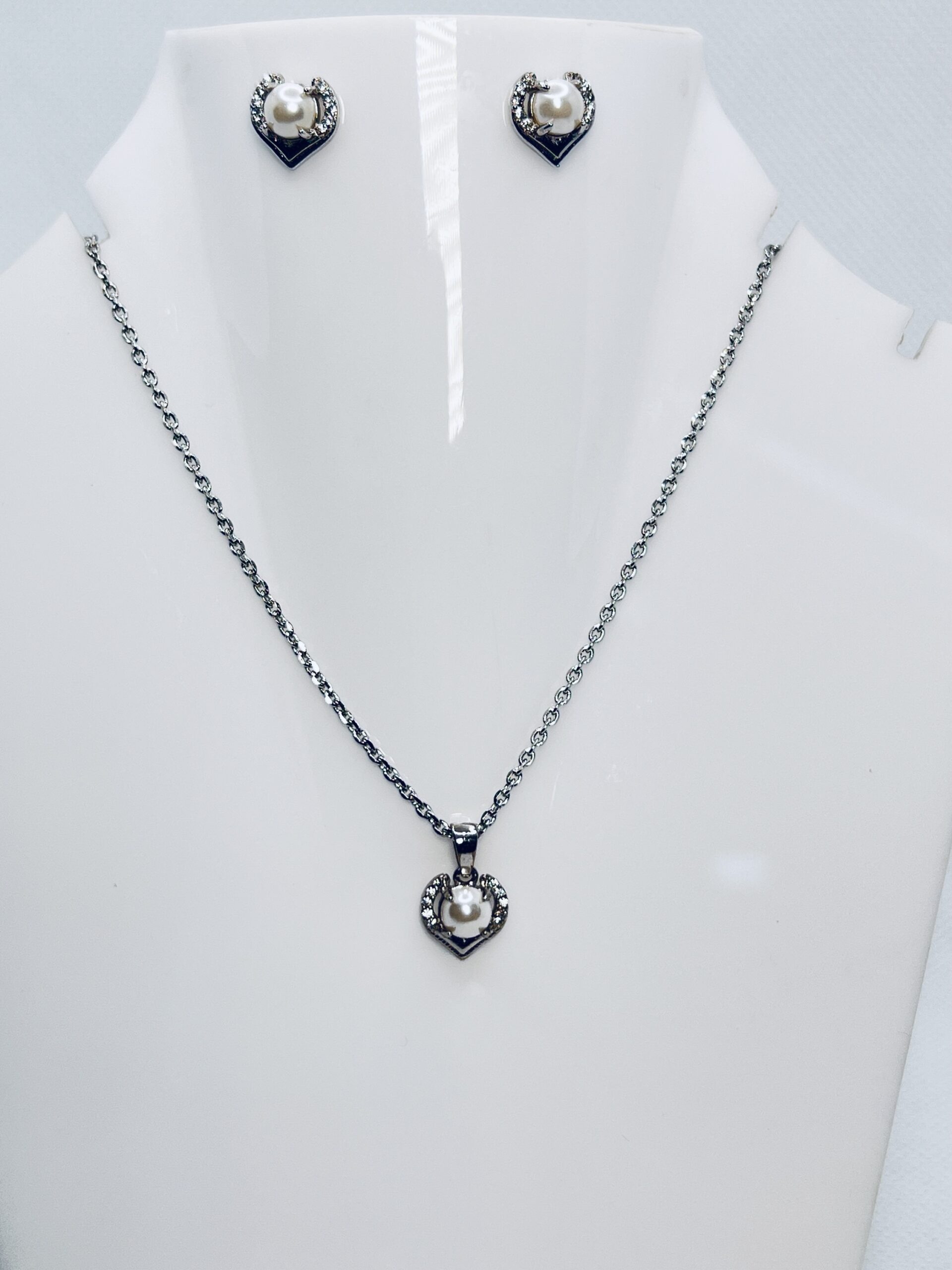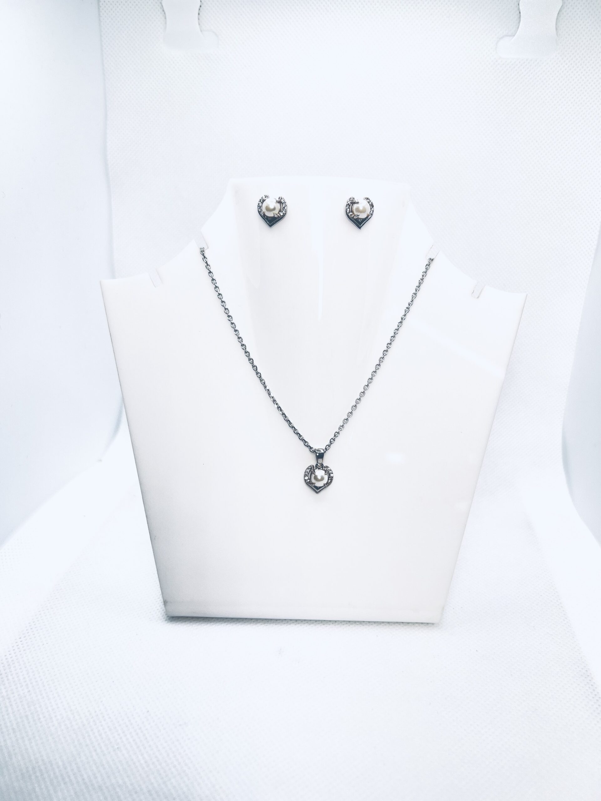 925 Sterling Silver Heart Pendant with pearl Necklace & Earrings This elegant jewelry set features a delicate heart-shaped design crafted from 925 sterling silver, adorned with a lustrous pearl at the center and sparkling accents for added charm. The matching necklace and earrings create a timeless and graceful look, perfect for both daily wear and special occasions. A symbol of love and sophistication, this set makes a thoughtful gift or a beautiful addition to your jewelry collection.