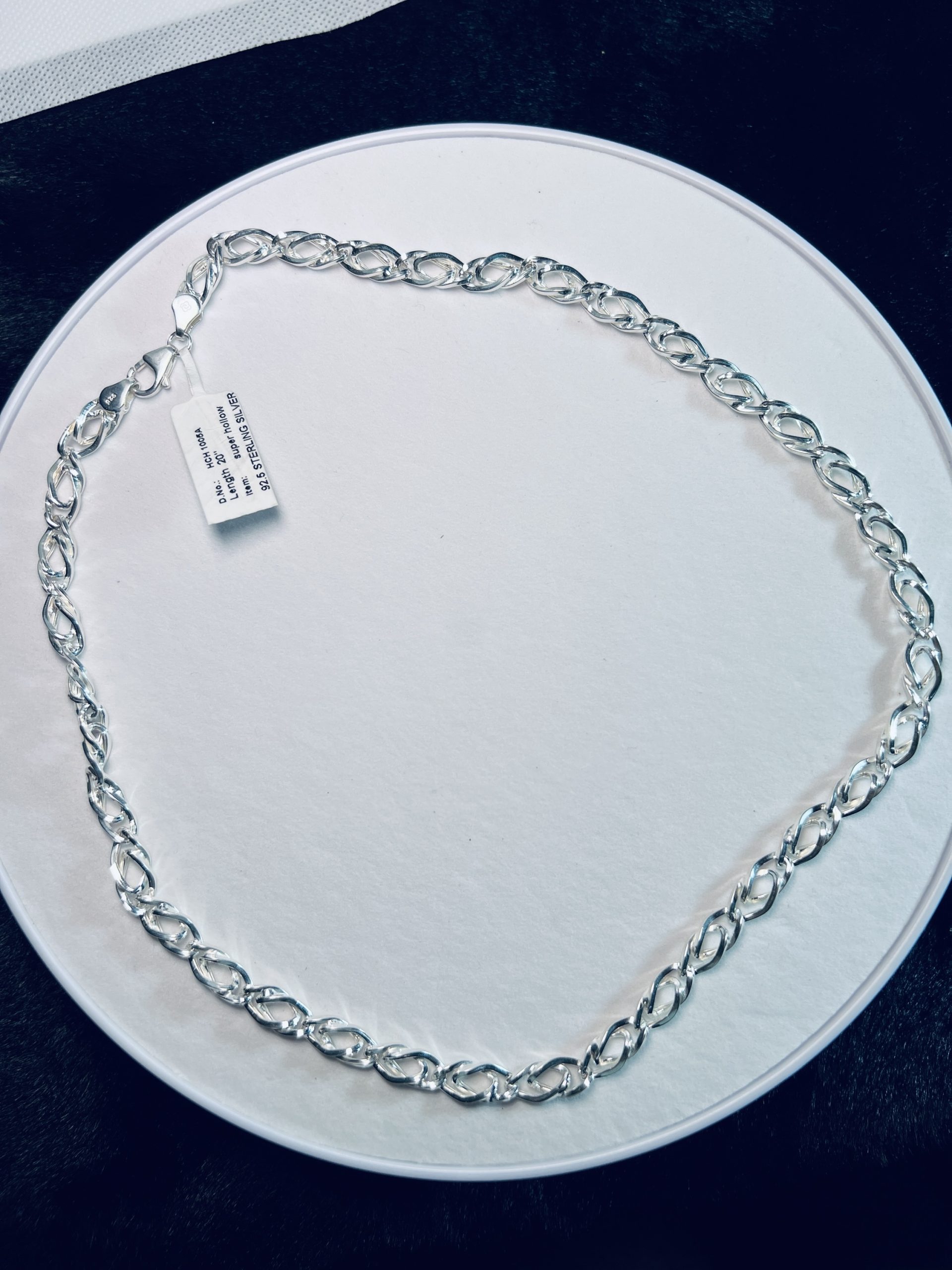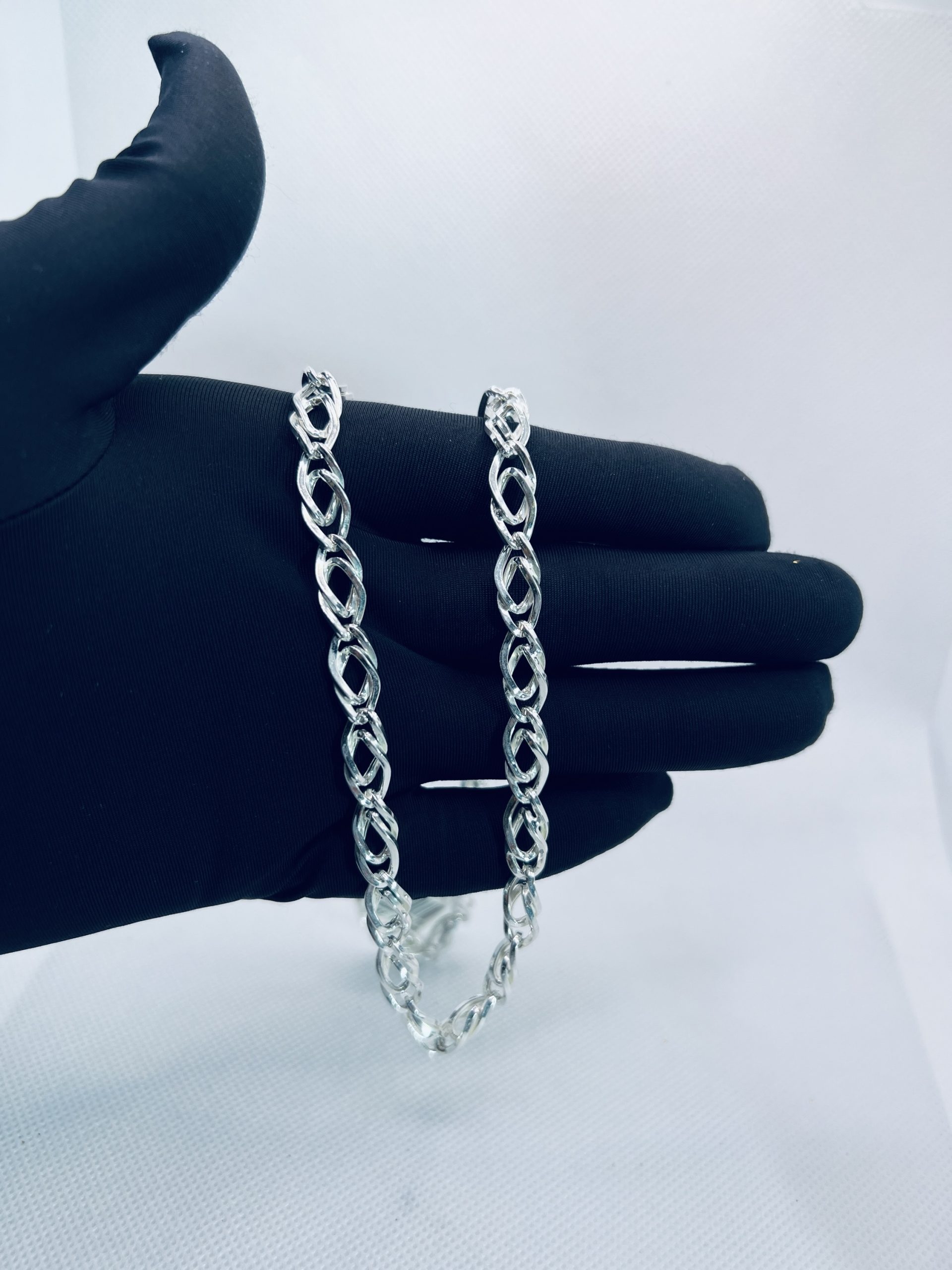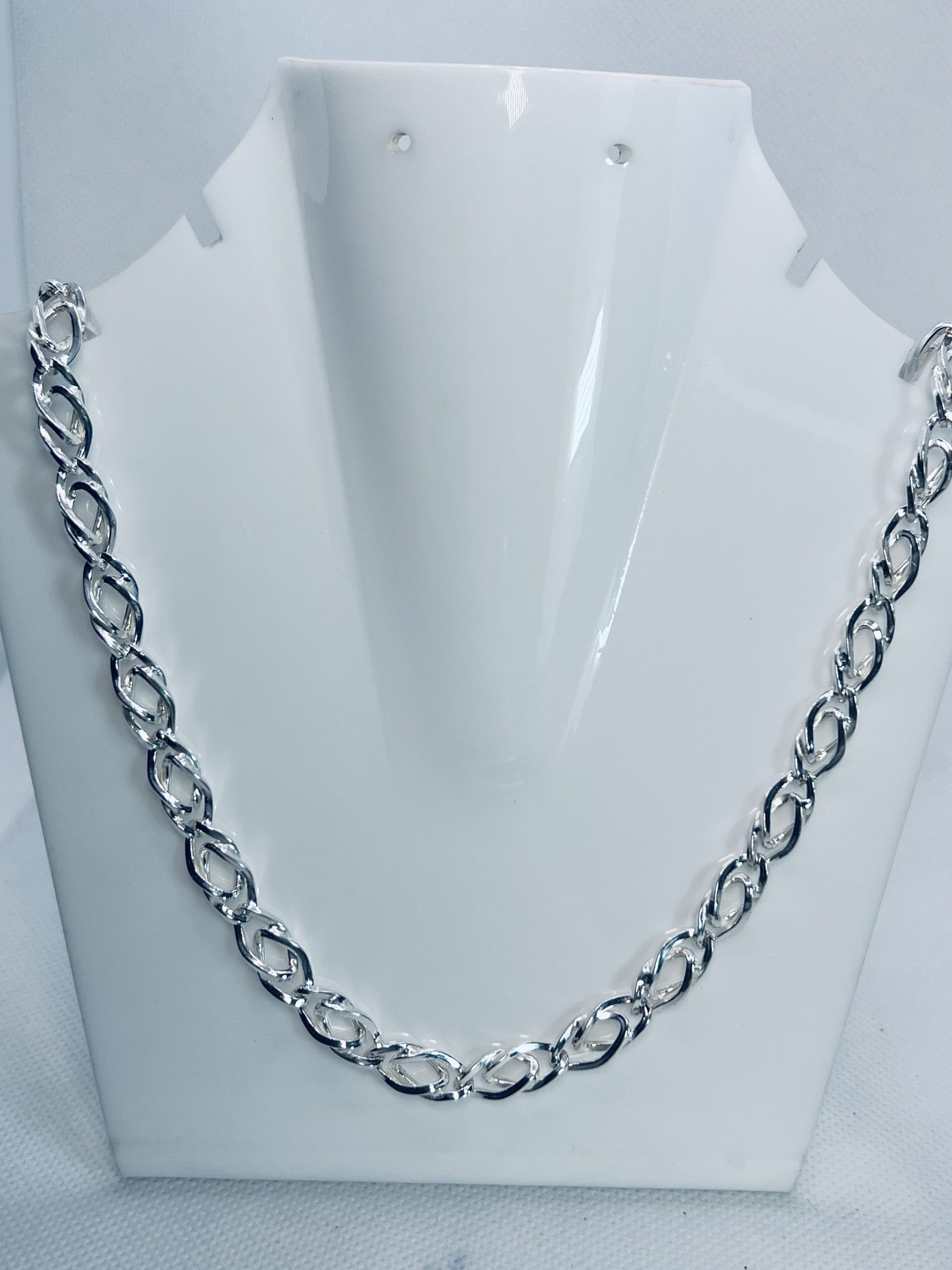 925 Sterling Silver Twisted Oval Link Chain for Men Make a stylish statement with this 925 sterling silver men’s chain, crafted in a bold twisted oval link design. The interlocked links create a unique textured look while the high-polish finish adds a brilliant shine. Strong, durable, and fashionable, this chain is perfect for men who want to combine elegance with everyday wearability.