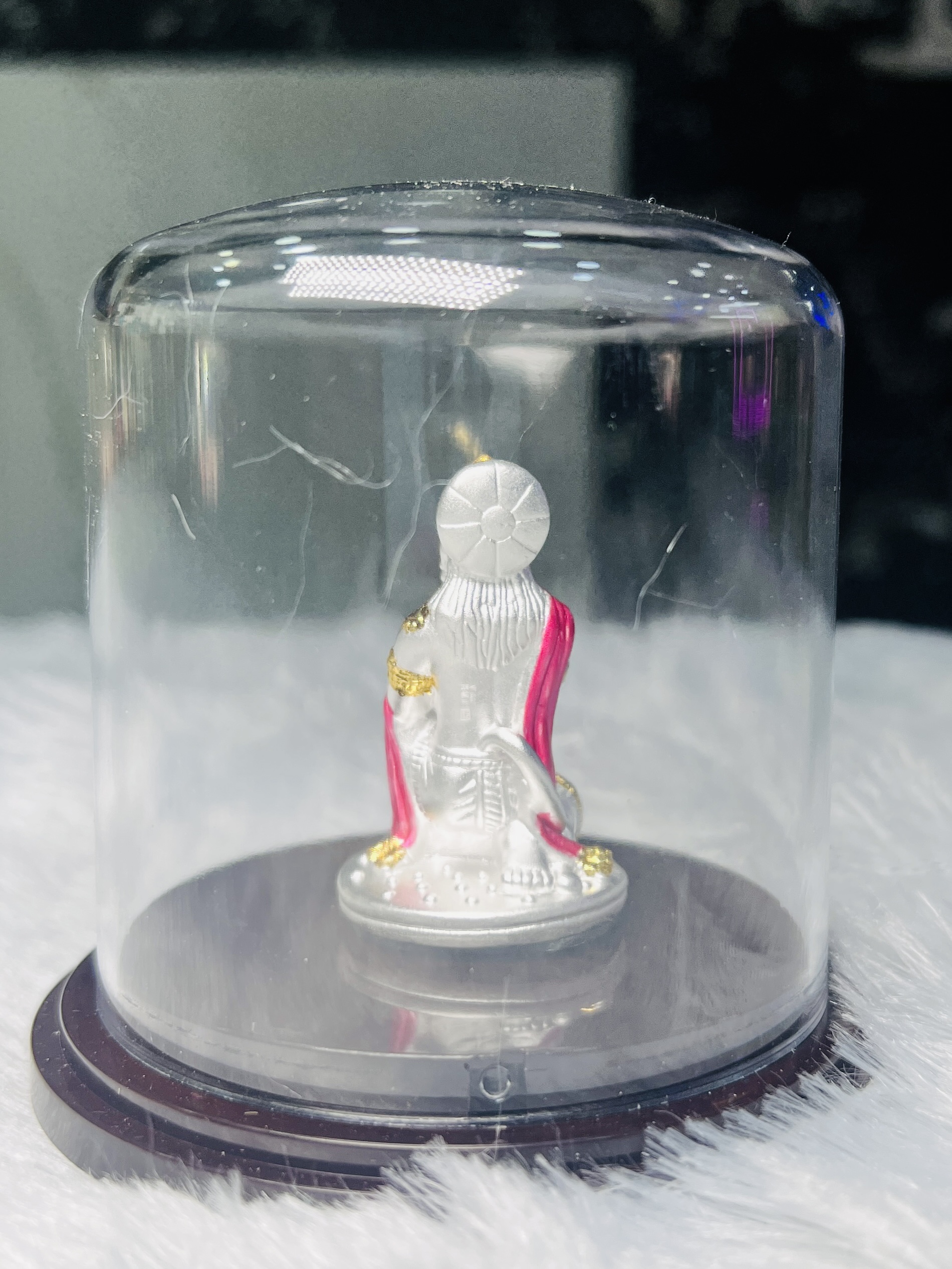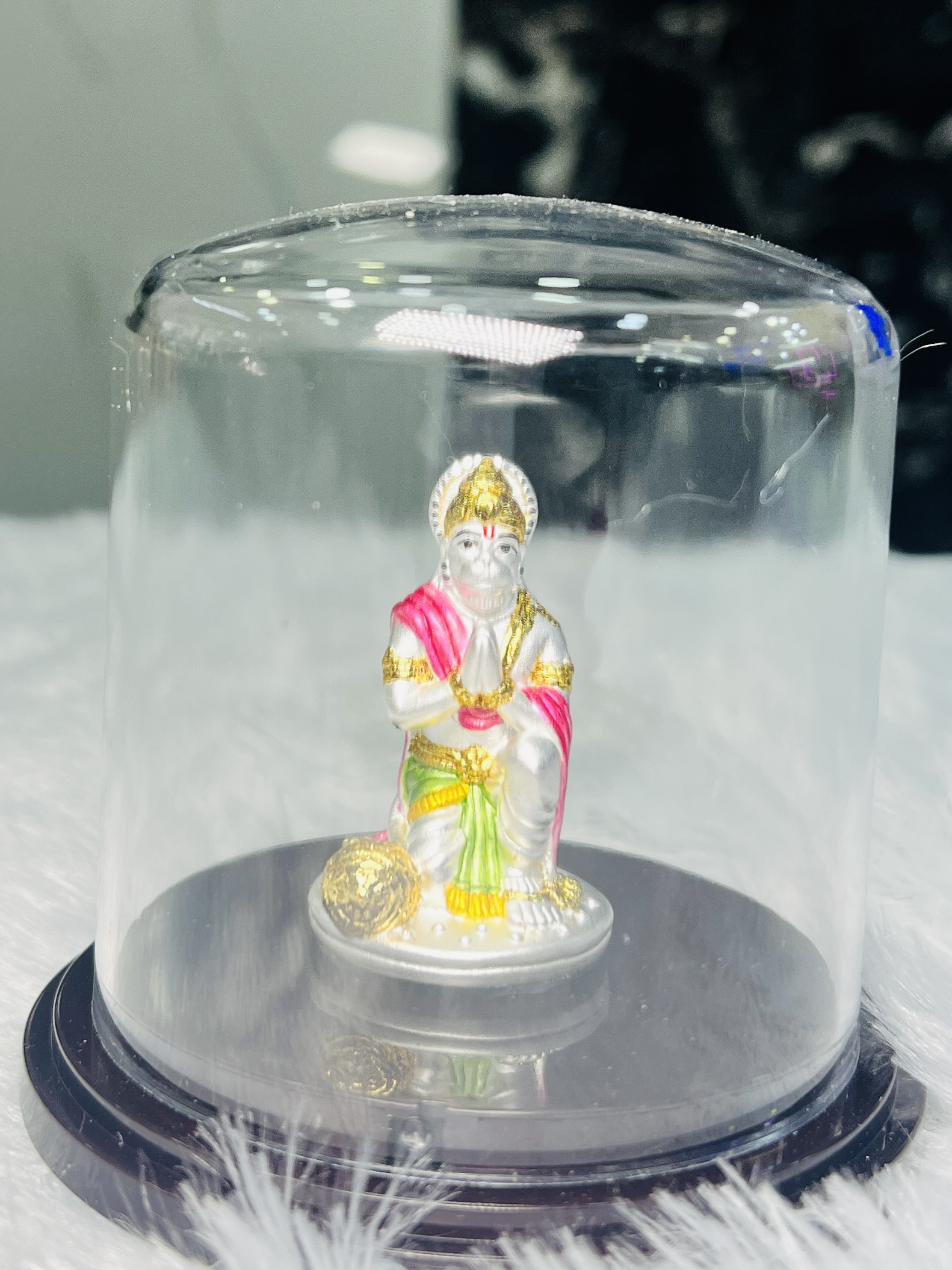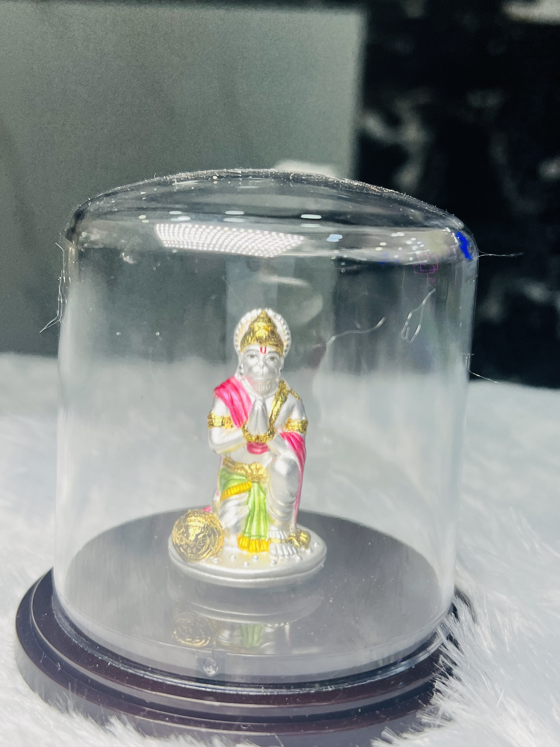 999 Pure Silver Hanuman Idol Bring divine blessings and positivity to your home with this beautifully crafted 999 pure silver Hanuman idol. Designed with intricate detailing and vibrant enamel accents, this idol radiates strength, devotion, and protection. Enclosed in a transparent dome case, it remains safe, dust-free, and perfect for gifting or personal worship. Ideal for your mandir, office desk, or as a spiritual gift for loved ones.