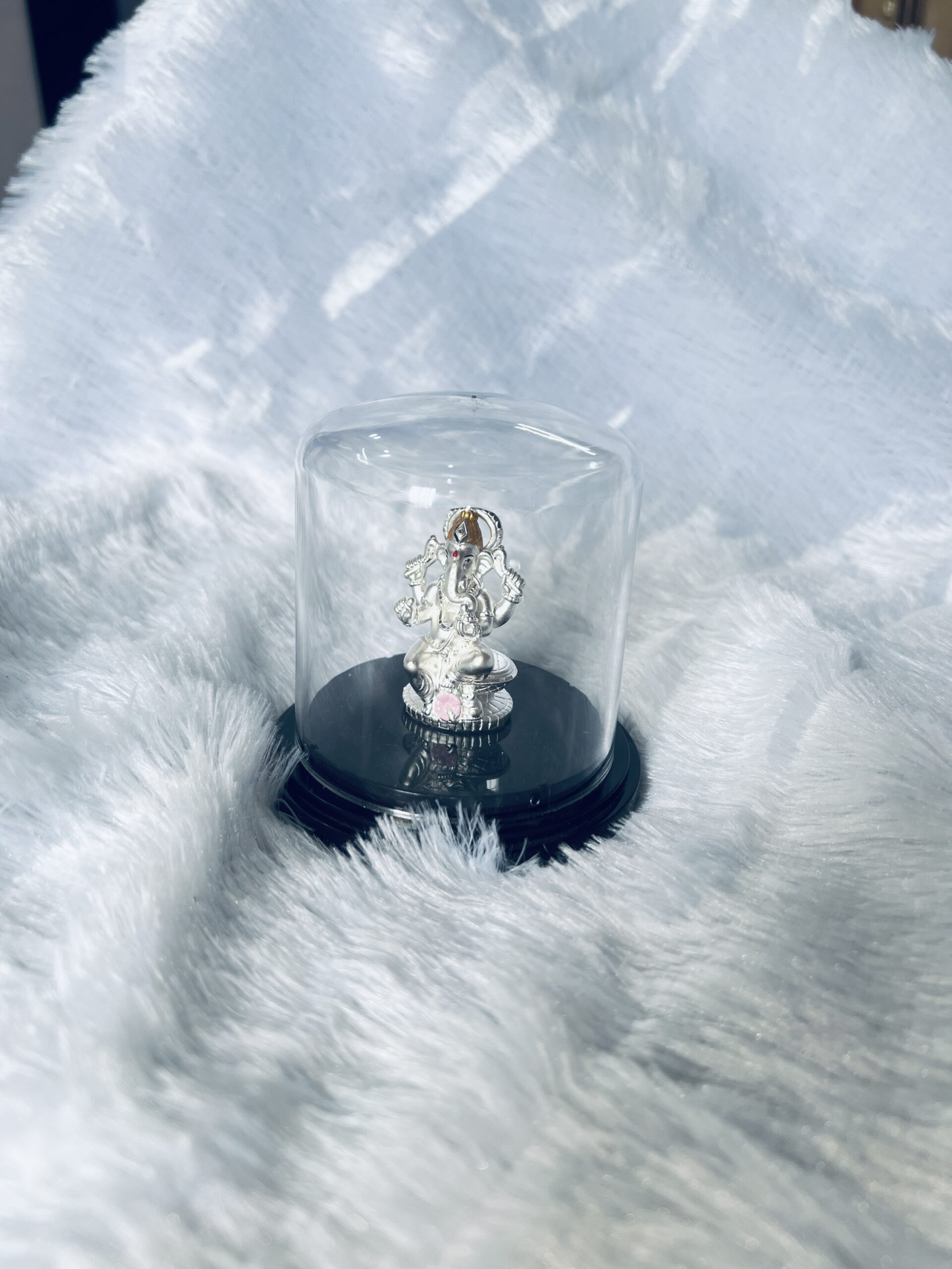 999 Silver Lord Ganesha Murt in Glass Dome Invoke divine blessings with this beautifully crafted 999 silver Lord Ganesha murti, adorned with emerald and ruby accents. The intricate detailing, coupled with the vibrant colors of the gemstones, brings a touch of elegance to this symbol of wisdom, prosperity, and good fortune. Protected in a sleek glass dome, this unique piece makes an ideal addition to your home, office, or as a thoughtful gift for any auspicious occasion