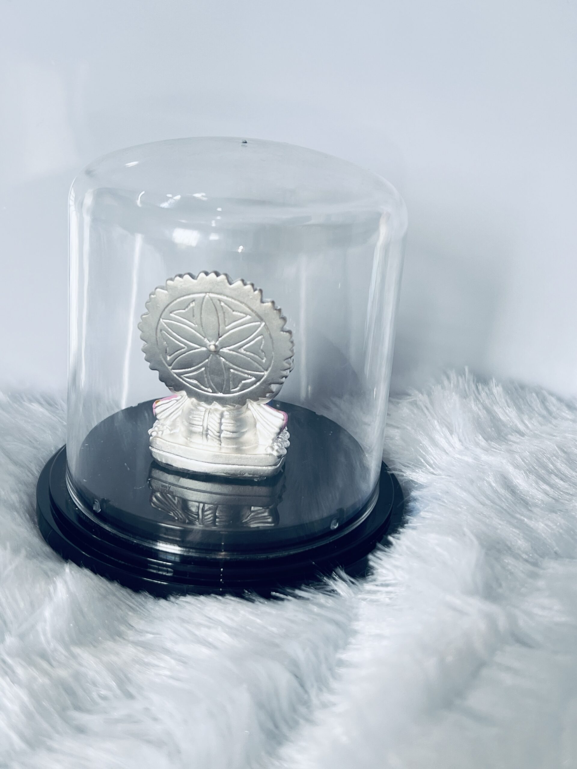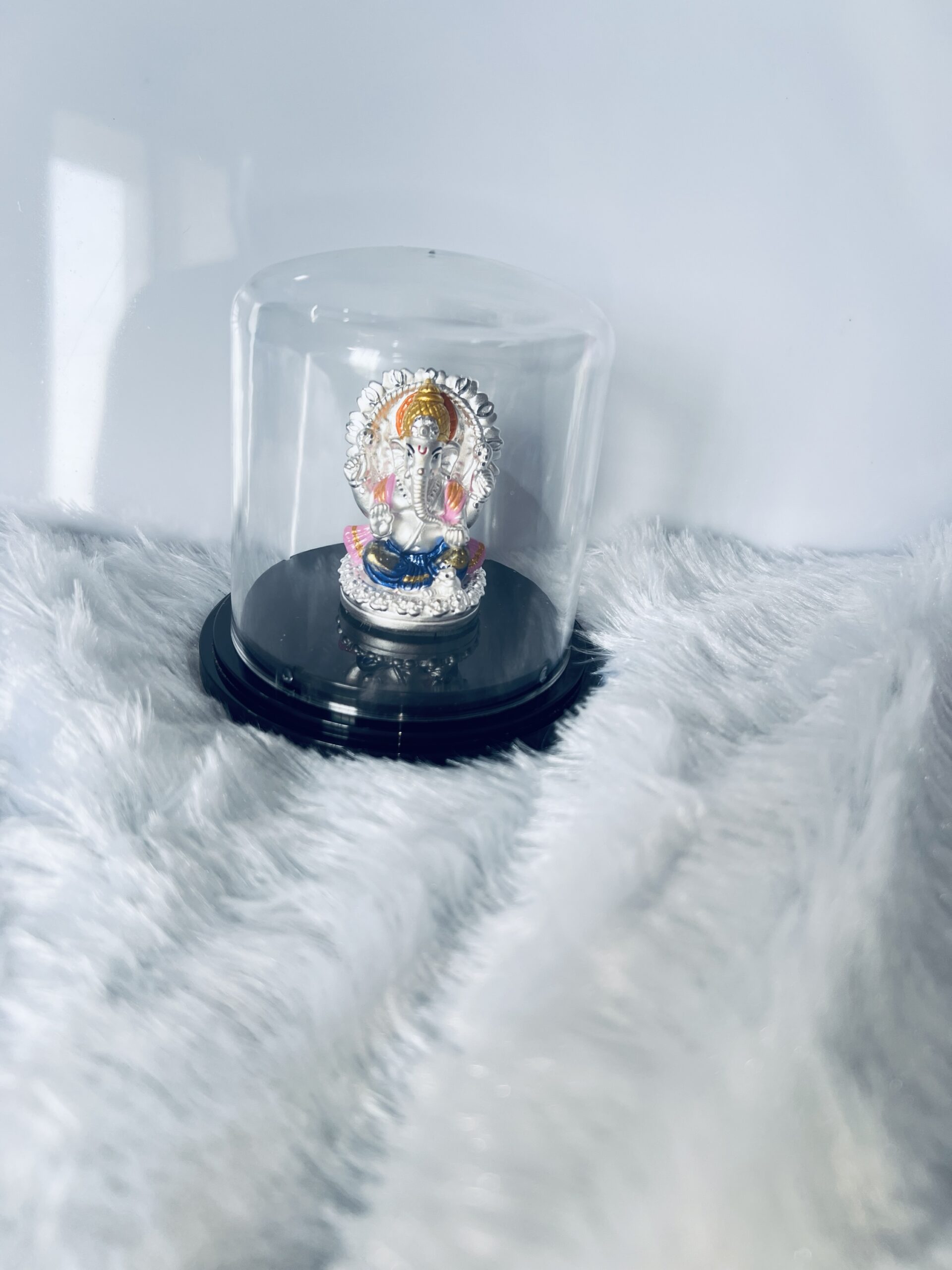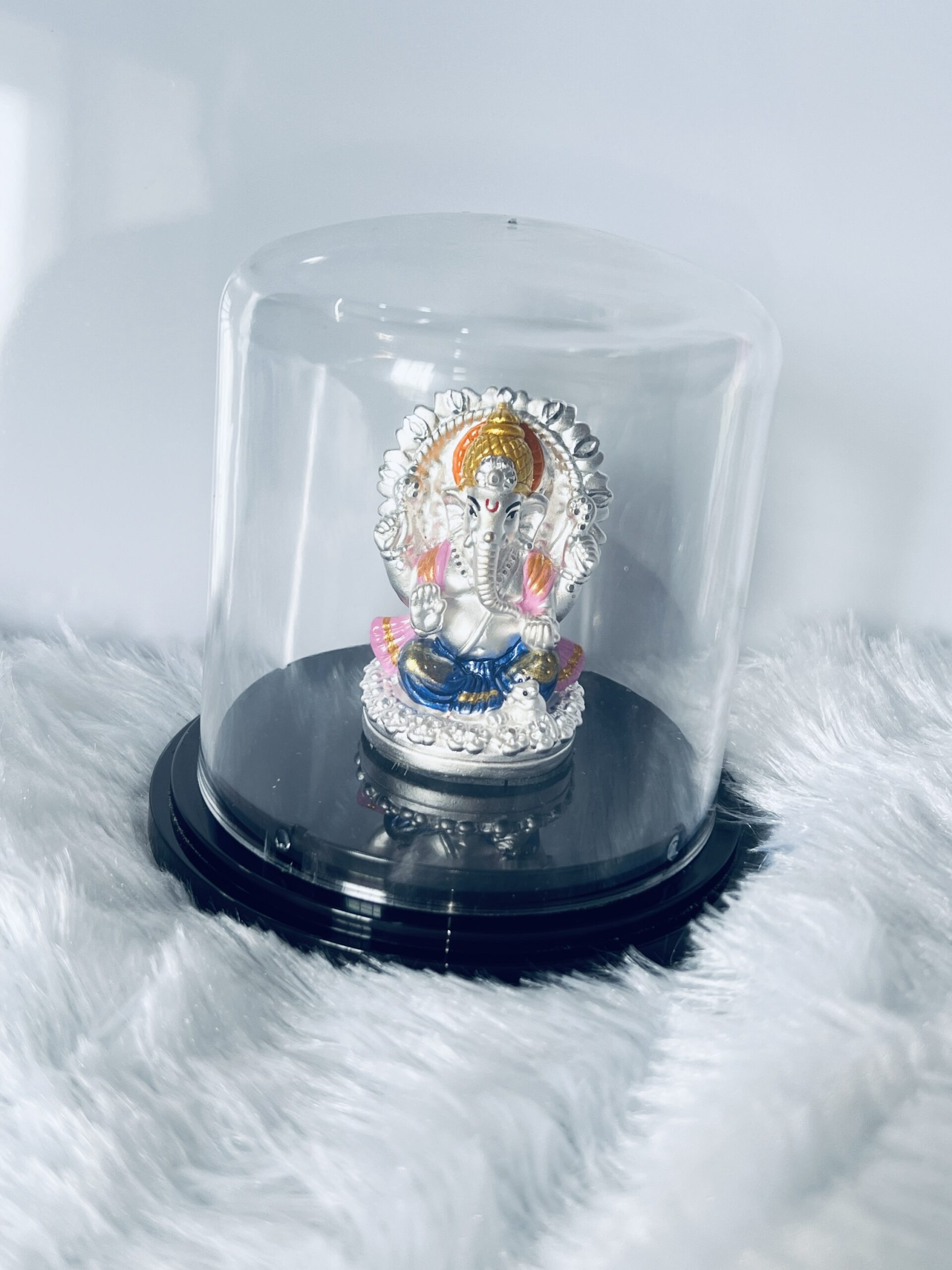 999 Silver Lord Ganesha Murti with Emerald & Gold Accents in Glass Dome Celebrate the divine presence of Lord Ganesha with this stunning 999 silver murti, beautifully adorned with emerald and gold accents. The intricate craftsmanship, combined with vibrant colors, enhances the spiritual energy of your home or office. Encased in a protective glass dome, this piece not only symbolizes wisdom and prosperity but also adds a touch of elegance to any space. Ideal for gifting or personal devotion, this Ganesha murti is perfect for invoking blessings of success and good fortune