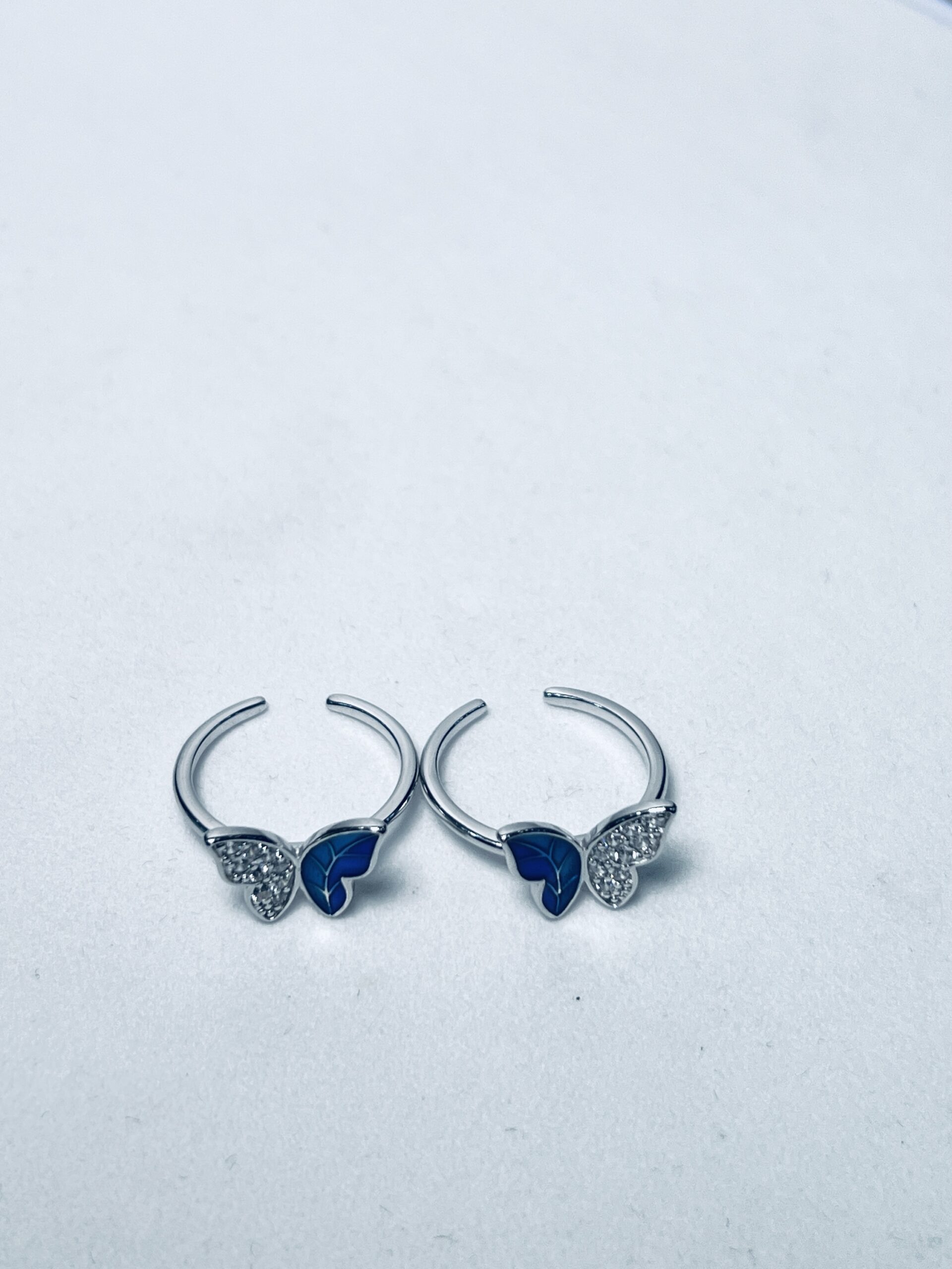 Blue Butterfly 925 Silver Toe Rings These delicate 925 silver toe rings feature a stunning butterfly design with one wing adorned with sparkling cubic zirconia stones and the other with a vibrant blue enamel finish. The rings are adjustable, ensuring a comfortable fit for any toe size. Perfect for adding a touch of elegance and whimsy to your summer look, these toe rings are a beautiful accessory for sandals, flip-flops, or going barefoot.