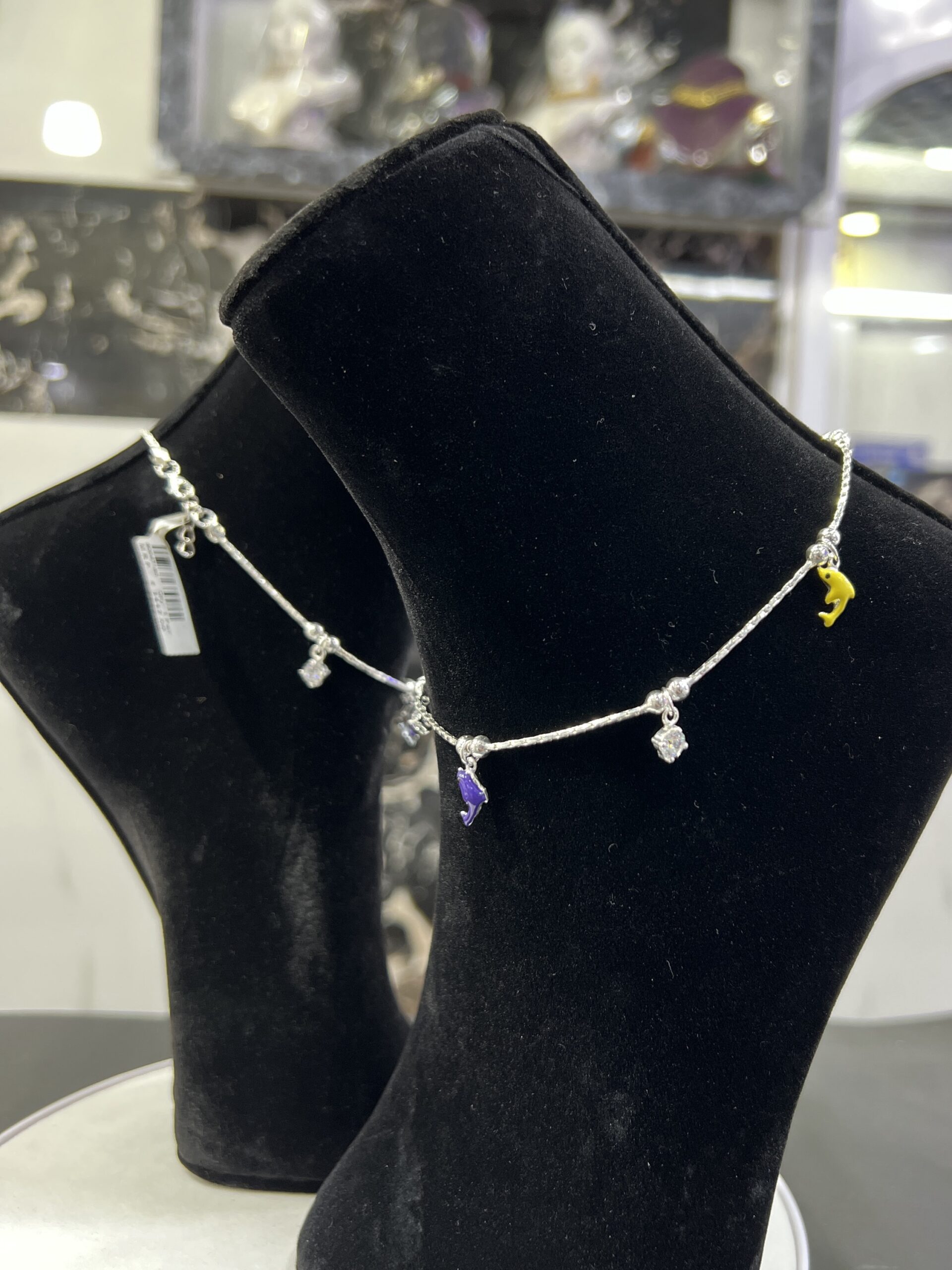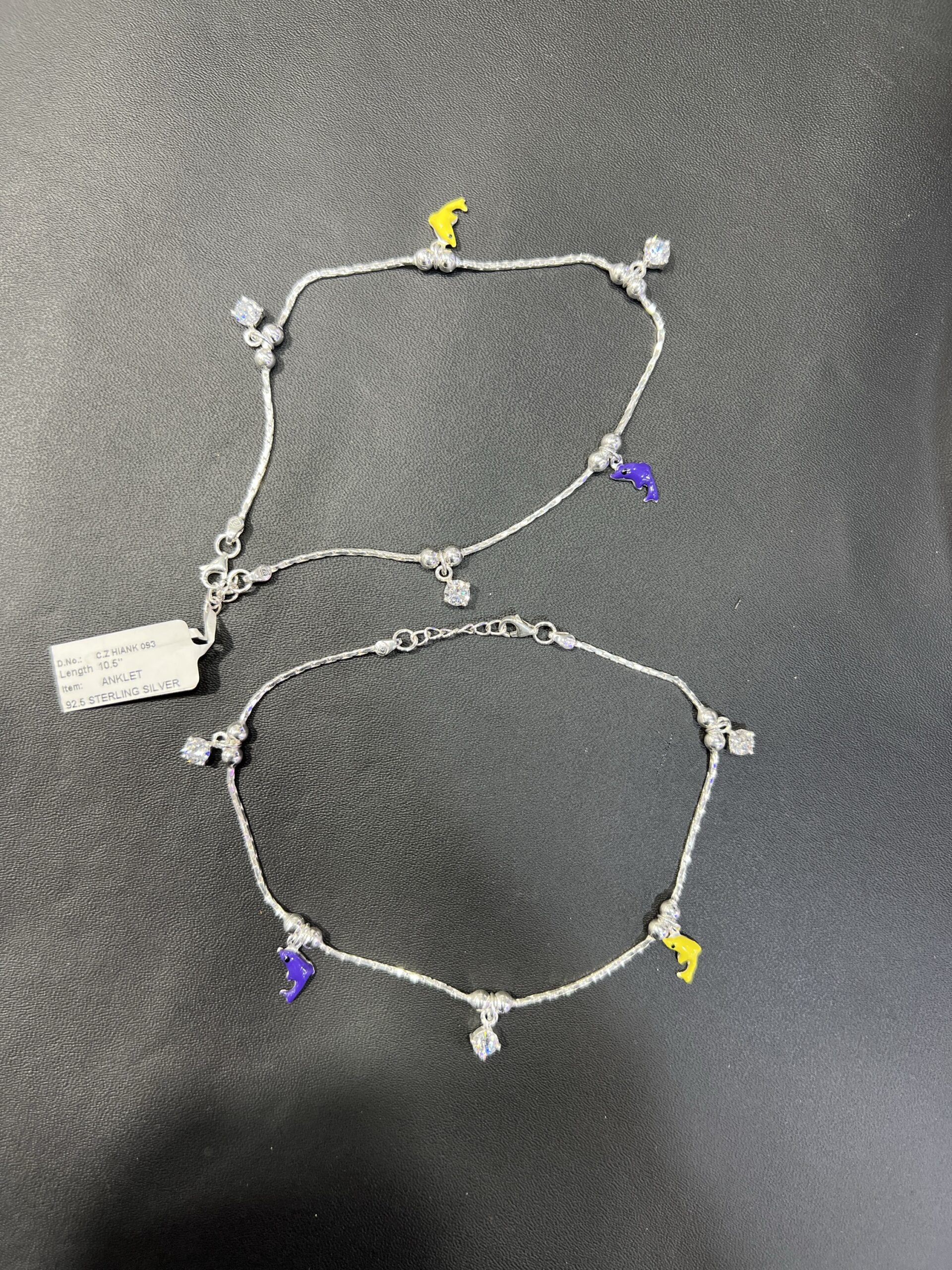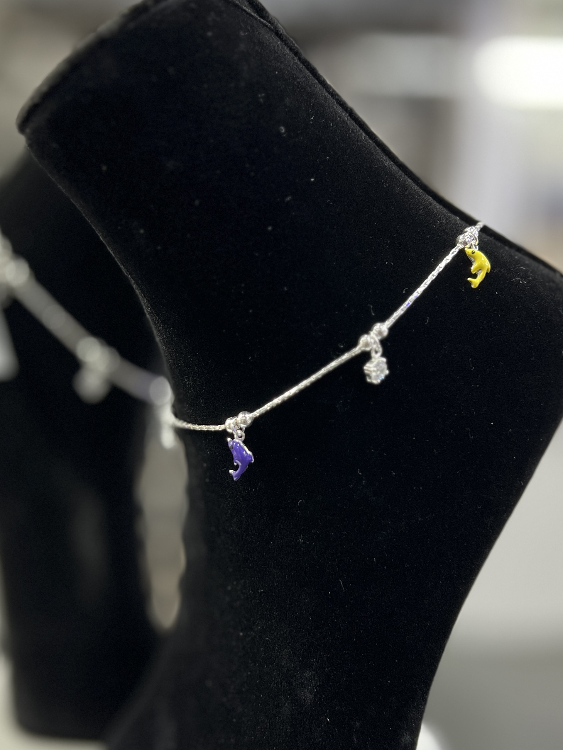 Playful Dolphin Silver Anklet This charming 925 sterling silver anklet is perfect for adding a touch of oceanic whimsy to your style. The delicate chain is adorned with small, polished beads and sparkling cubic zirconia dangles. The highlight of the piece is the collection of vibrant yellow and purple enamel dolphin charms, which create a fun and lively feel. This delightful accessory combines subtle sparkle with a playful, marine-inspired design.