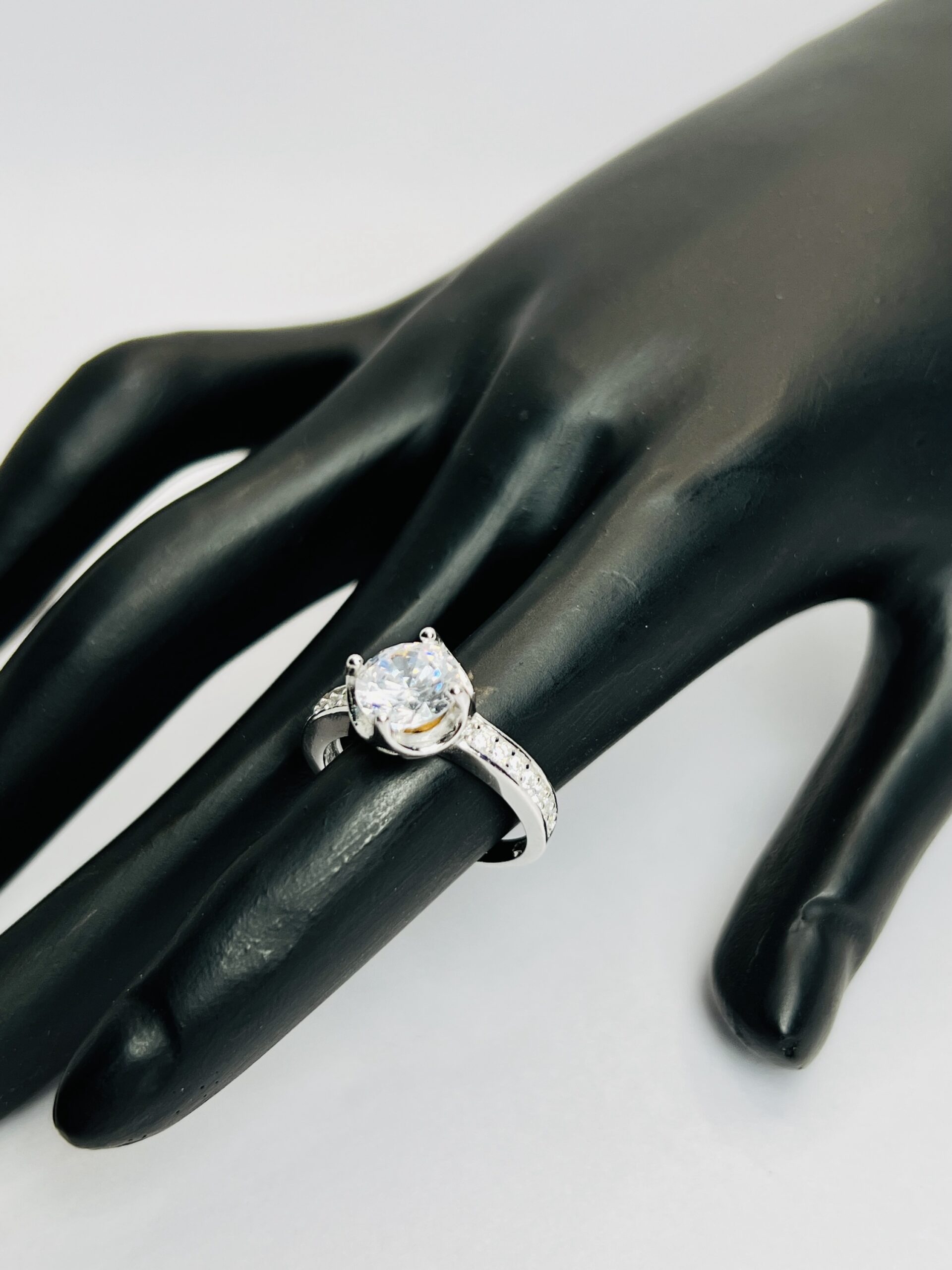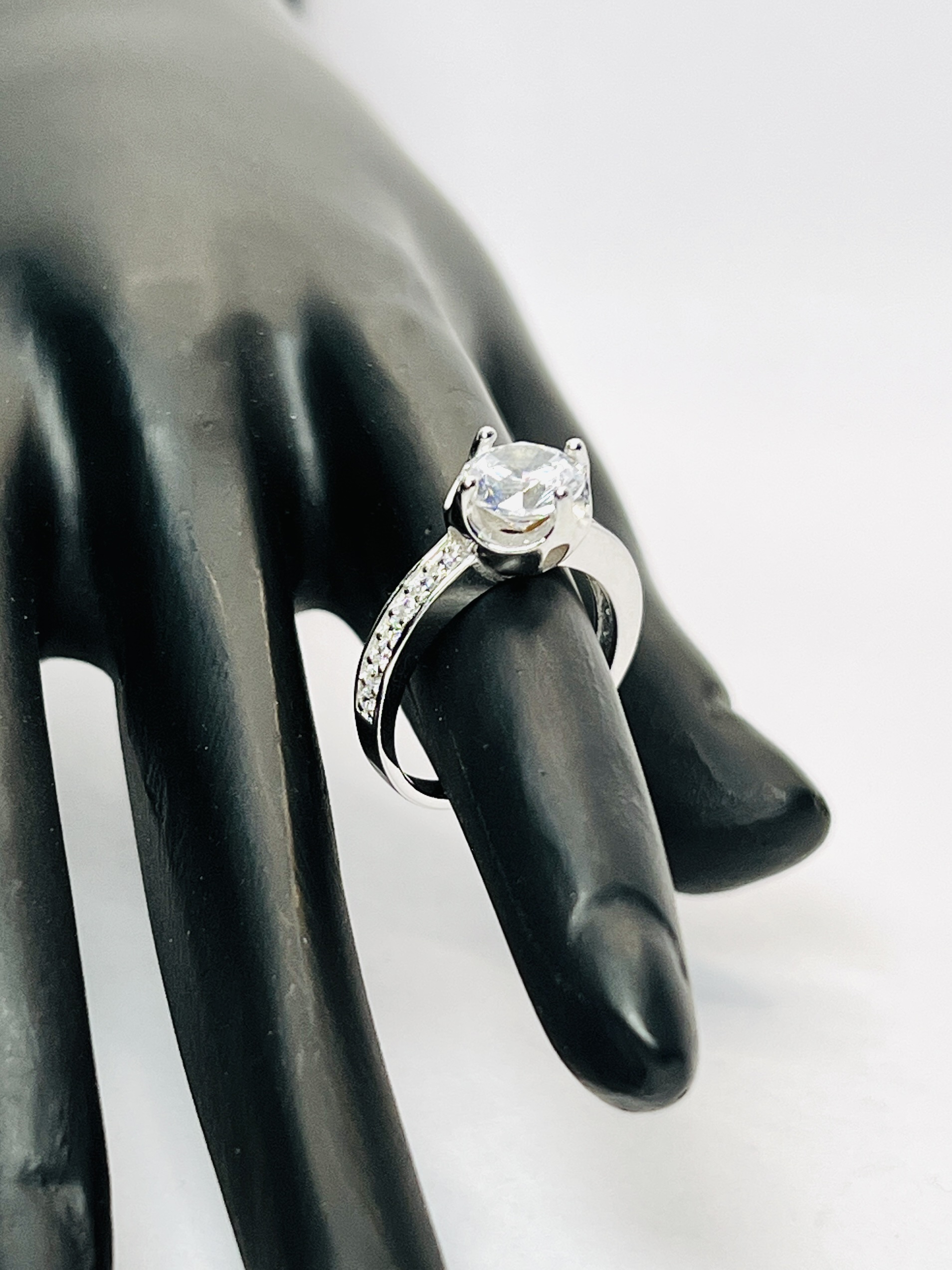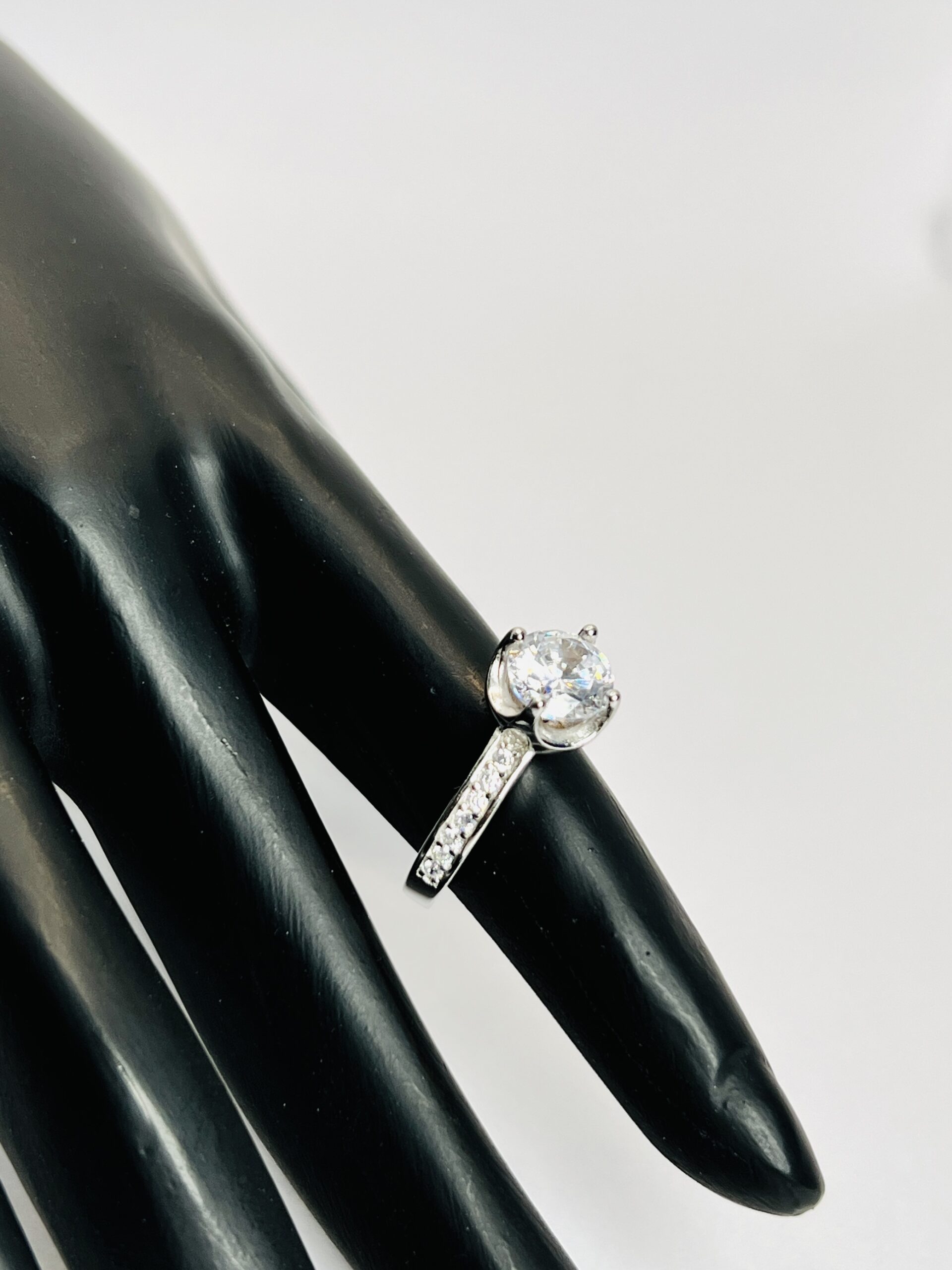 Silver Engagement Ring with Pave Setting size 6 This beautiful 925 sterling silver ring for women is a perfect blend of classic and modern style. It features a dazzling, brilliant round-cut cubic zirconia stone, held securely by a six-prong setting. The band is meticulously adorned with a row of small, sparkling pave-set stones, adding extra brilliance and a touch of modern elegance. The combination of the classic solitaire and the brilliant side stones makes this an ideal choice for an engagement ring or a timeless piece for any special occasion.