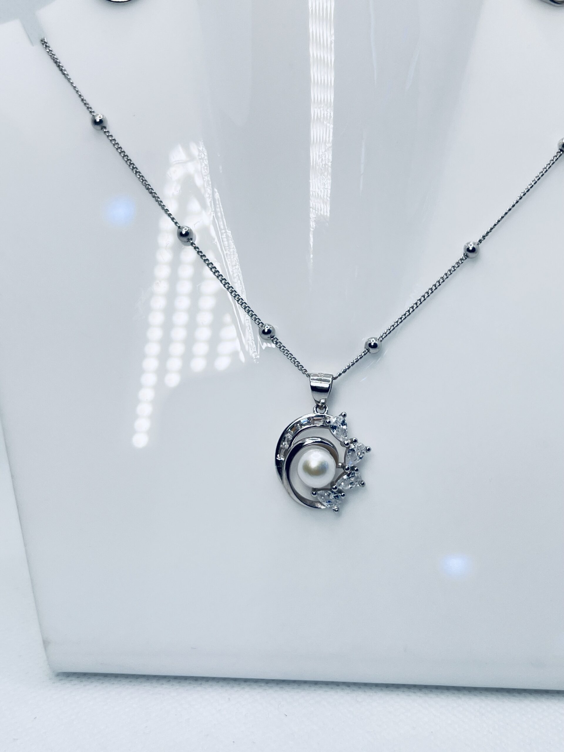 Silver Pearl Pendant Necklace Earrings Set for Women Add timeless elegance to your collection with this beautifully crafted 925 sterling silver jewelry set, featuring a graceful pendant necklace and matching stud earrings. The design highlights a lustrous white pearl at the center, encircled by a modern silver curve adorned with sparkling cubic zirconia accents, symbolizing sophistication and grace.
