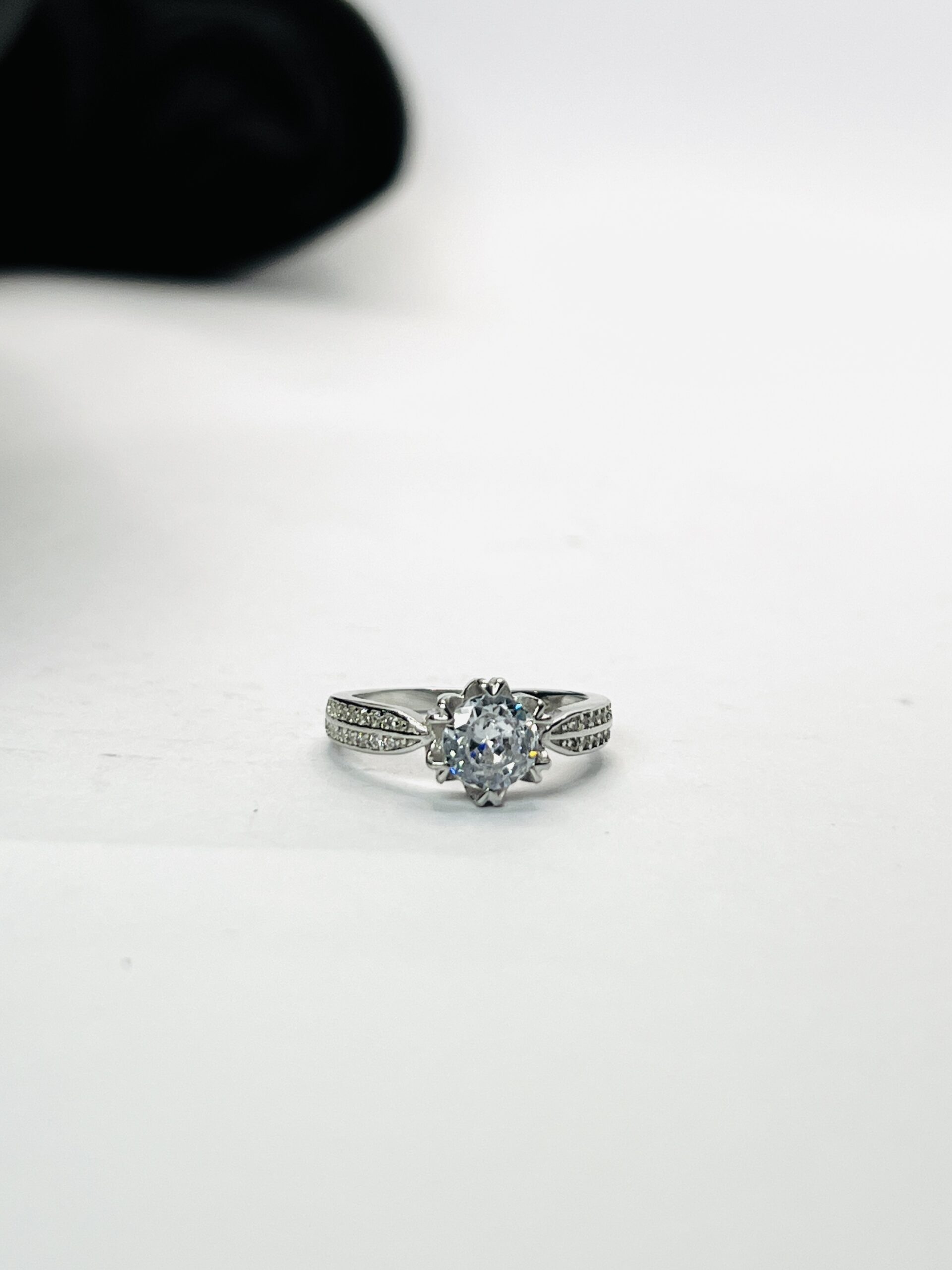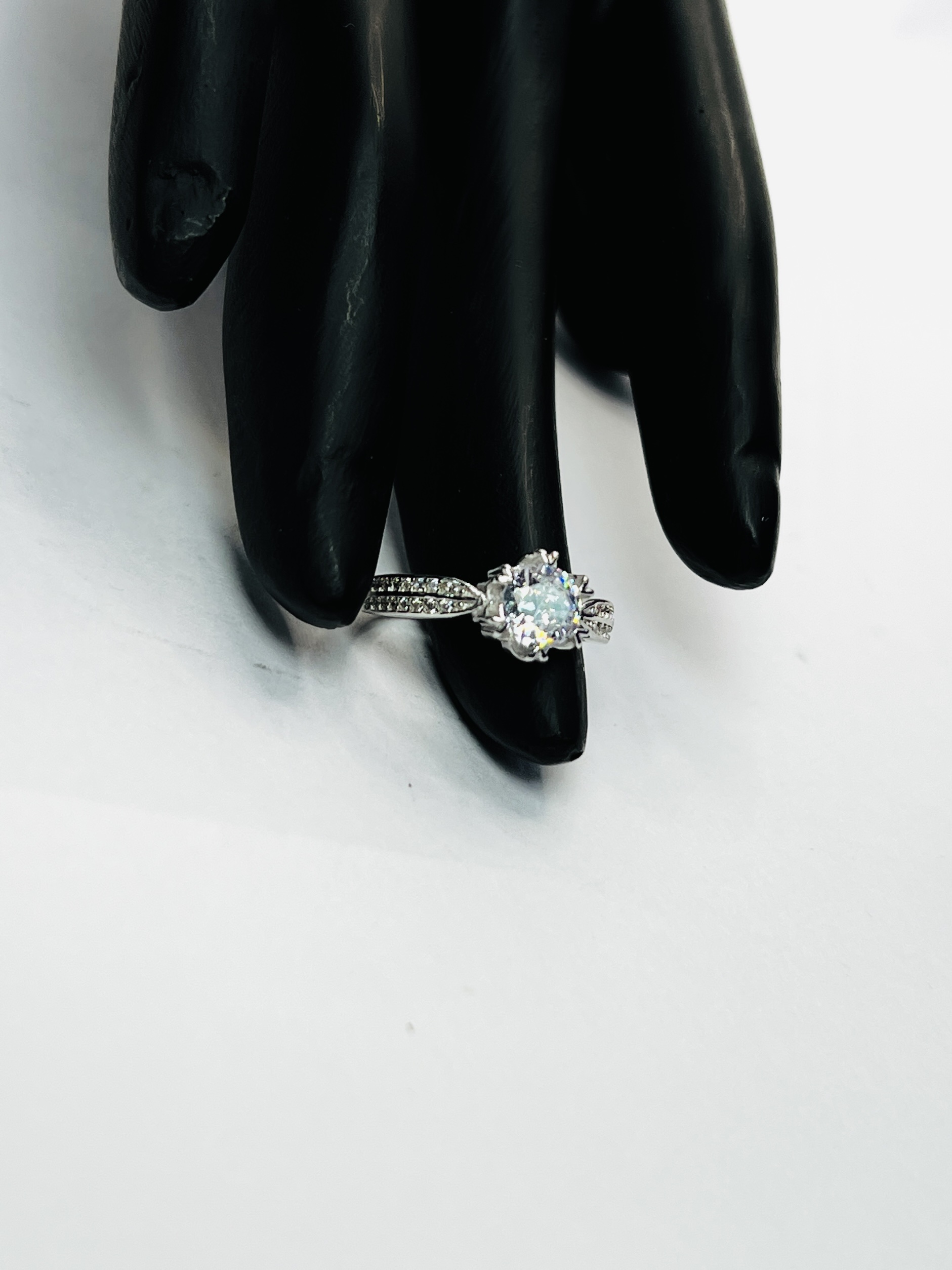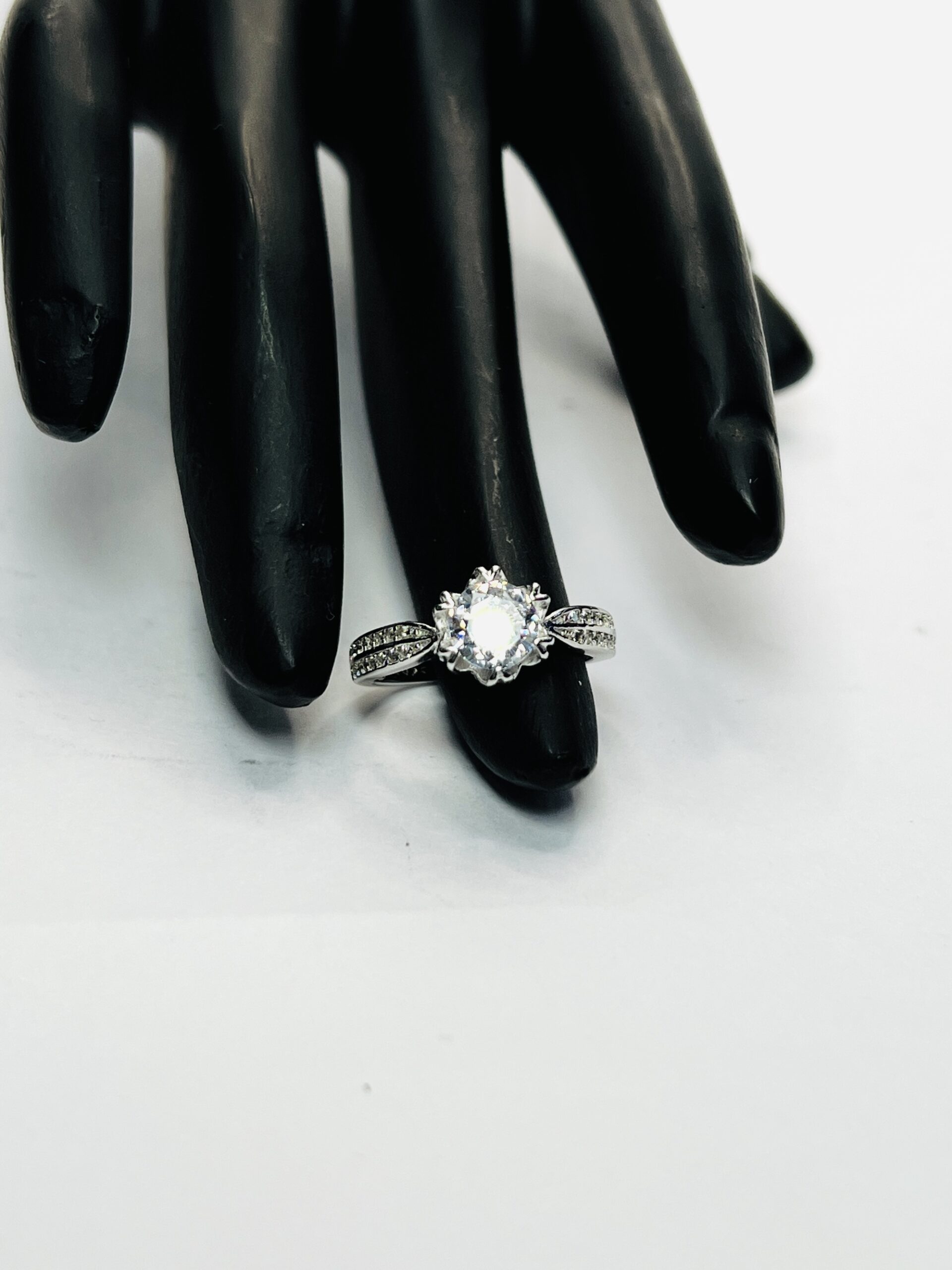 Silver Flower Engagement Ring size 6 This exquisite 925 sterling silver ring for women features a stunning, flower-inspired design. The center stone is a brilliant cubic zirconia that mimics a six-petal bloom, radiating elegance and light. Sterling Silver Flower Engagement Ring The split-shank band is beautifully adorned with pave-set stones, adding extra sparkle and a touch of modern sophistication. Perfect for a special occasion or as a unique engagement ring, this piece combines timeless beauty with contemporary style.
