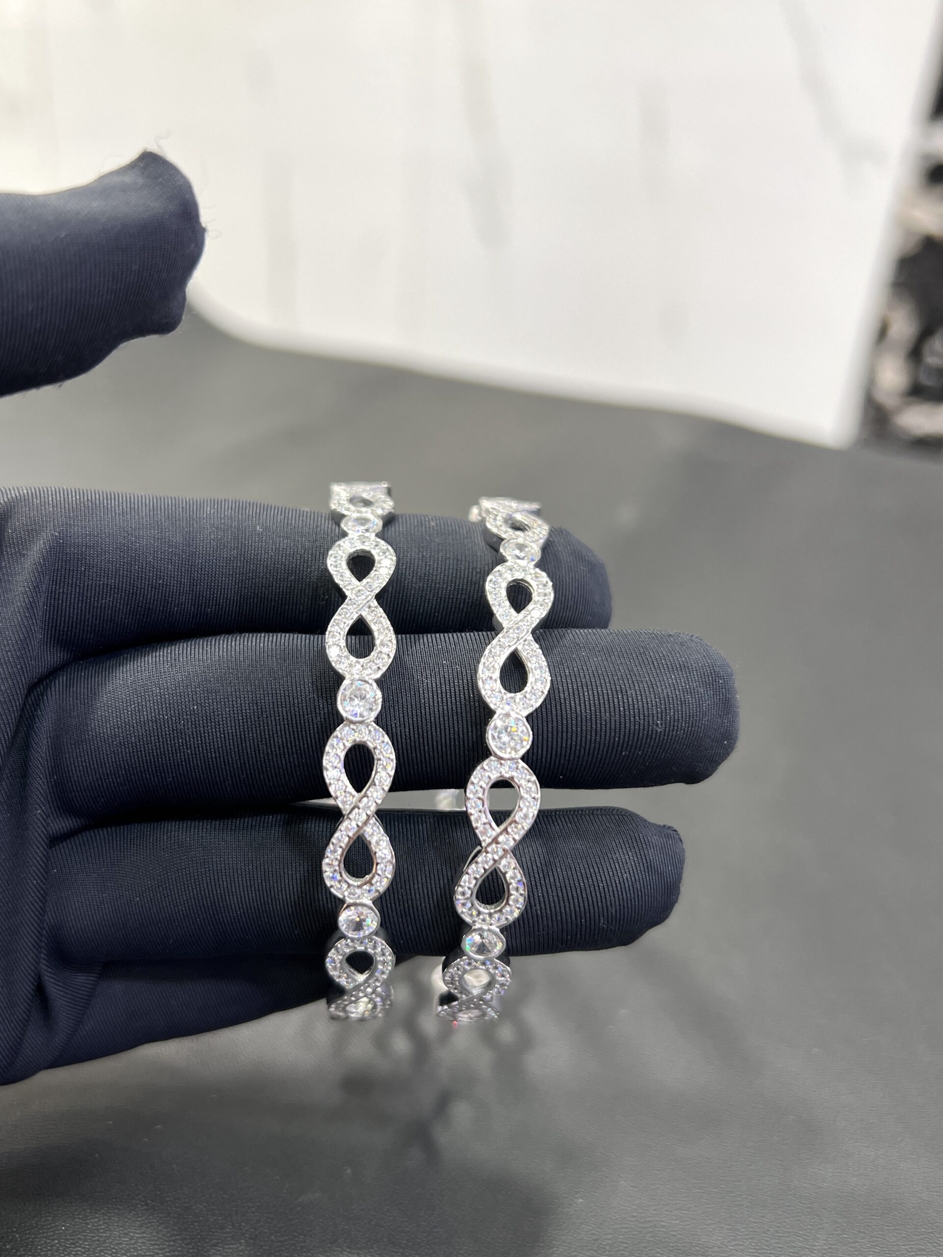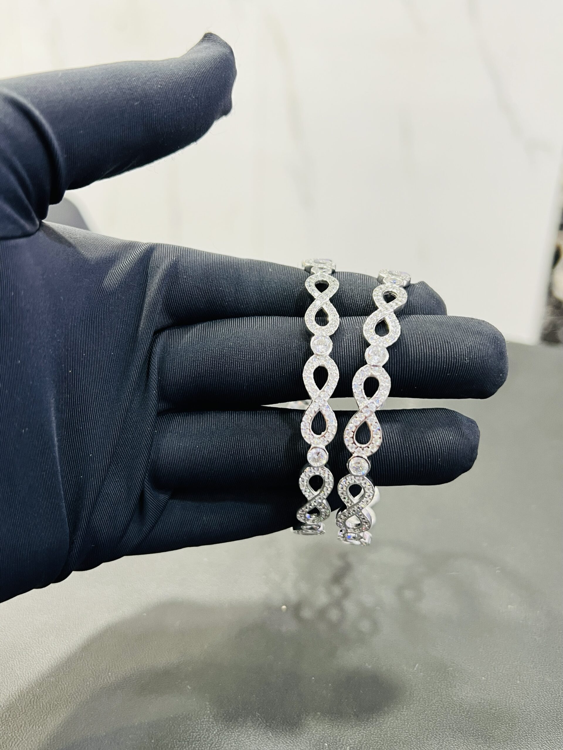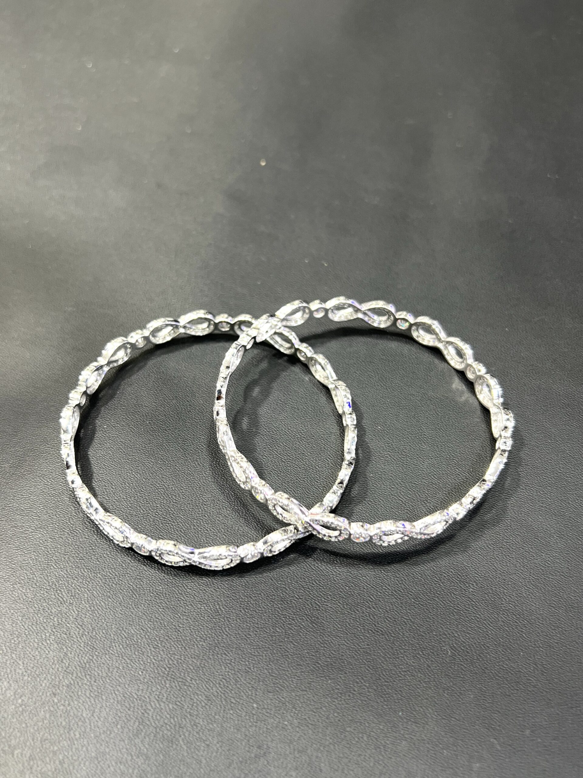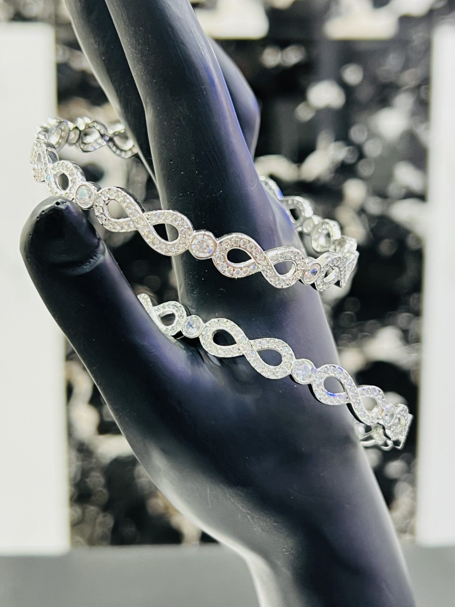 Sterling Silver “Infinite Sparkle” Bangles size 2.8 This elegant pair of 925 sterling silver bangles is a beautiful symbol of eternal love and style. The design features a continuous series of interlocking infinity symbols, with each loop meticulously set with sparkling cubic zirconia stones. A larger, brilliant-cut stone rests at the center of each figure-eight, creating a mesmerizing pattern of light and a luxurious texture. These bangles are a sophisticated and meaningful accessory, perfect for adding a touch of glamour to any outfit.