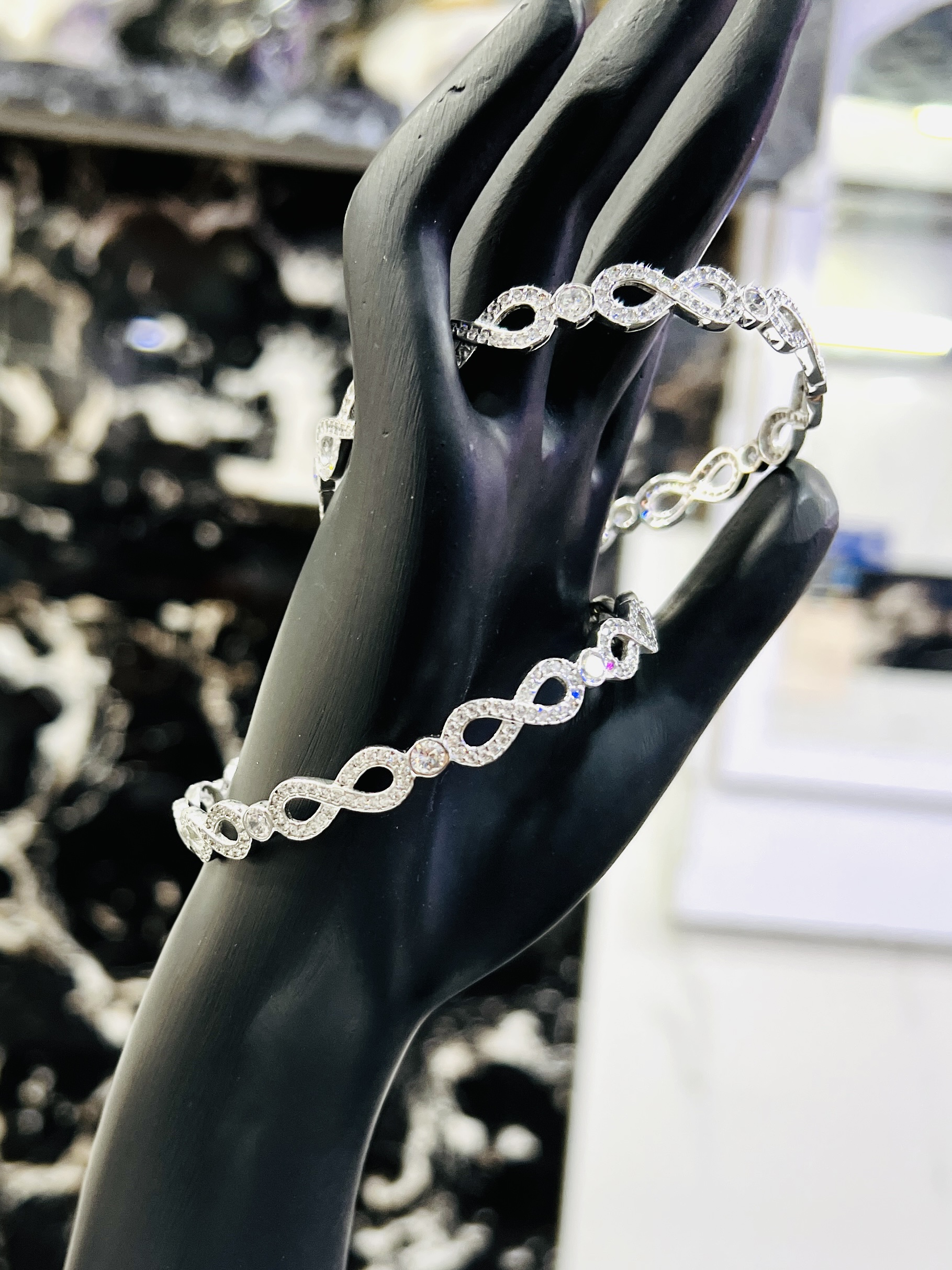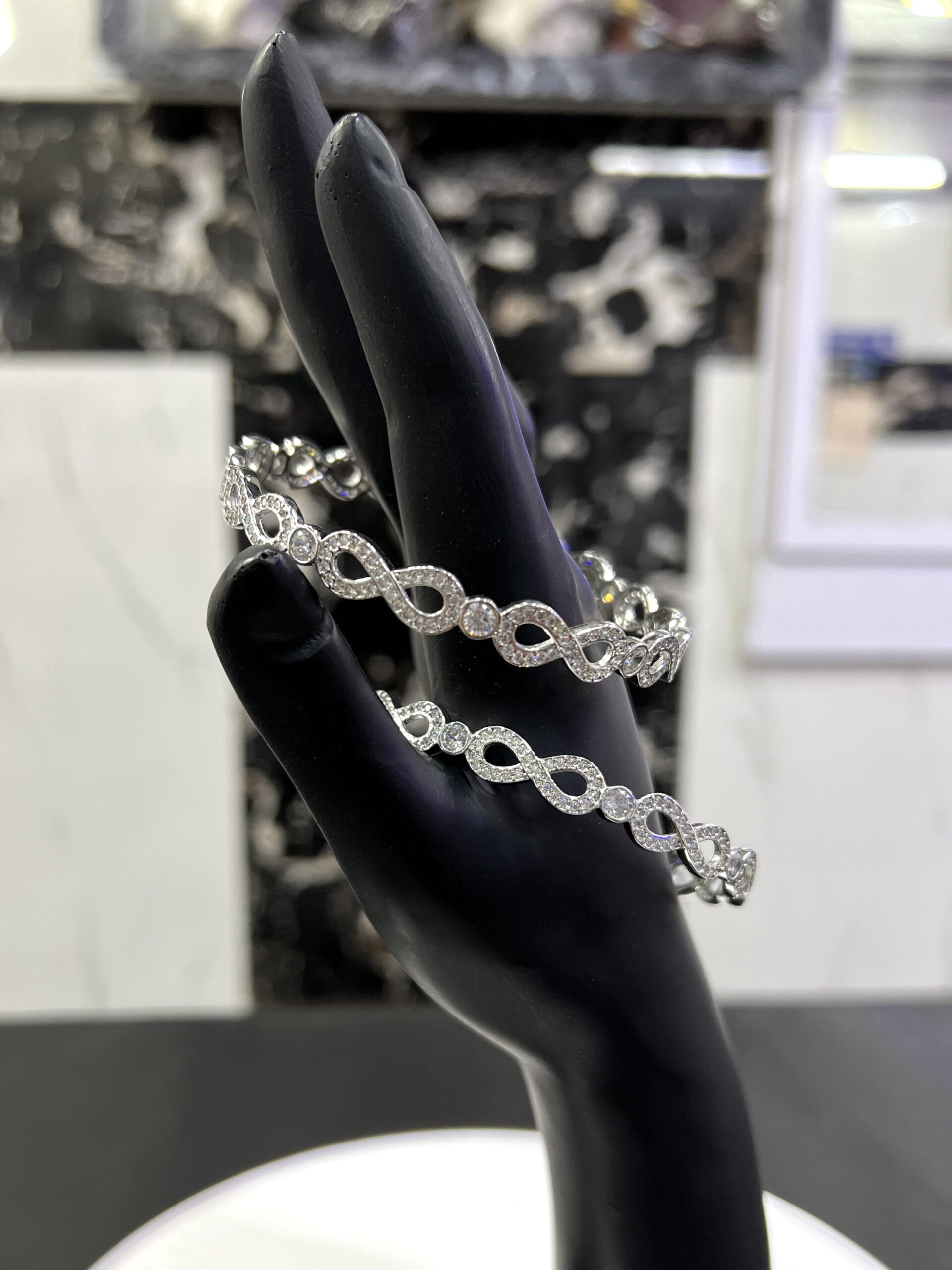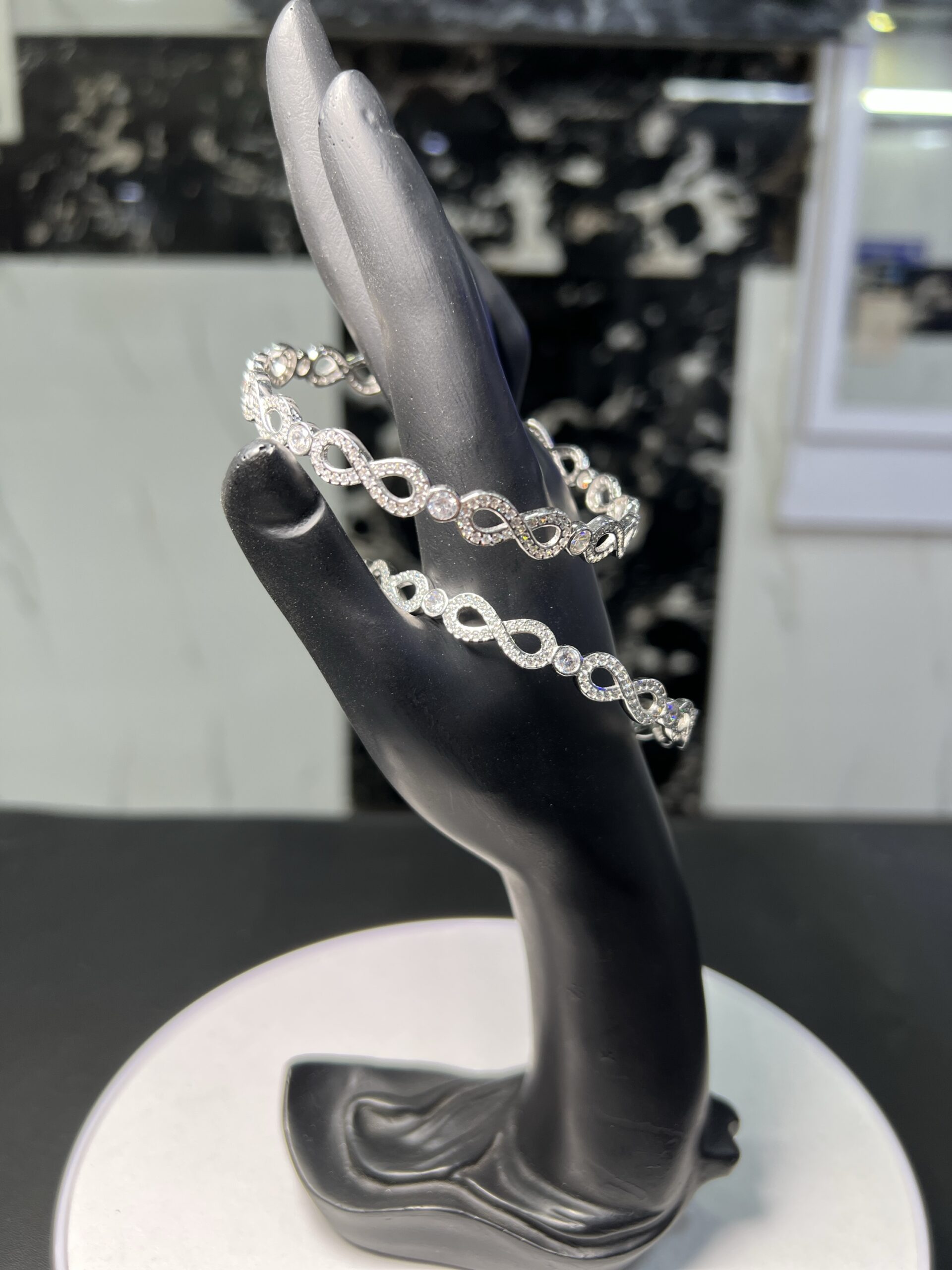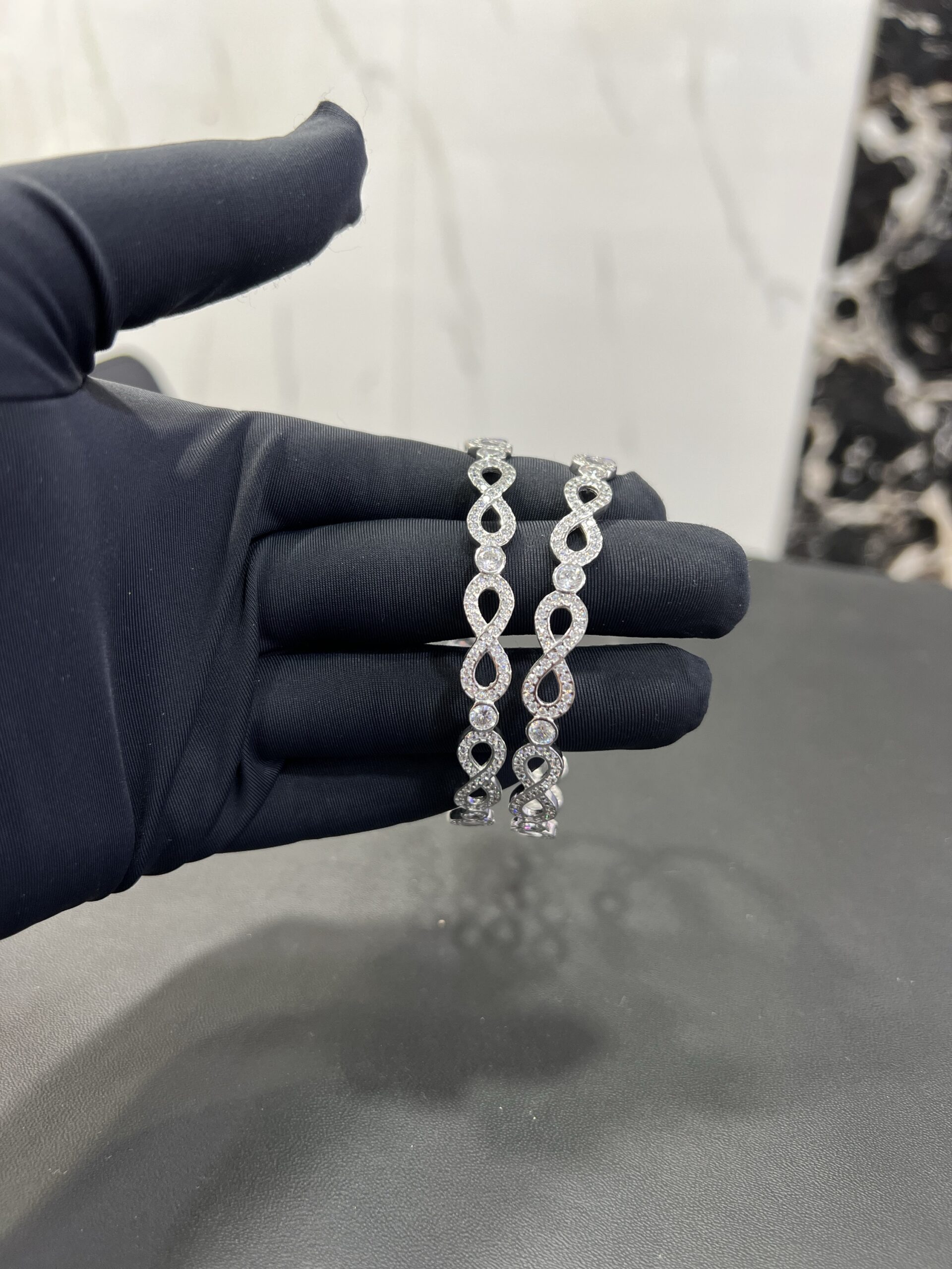 Sterling Silver “Infinite Sparkle” Bangles size 2.8 This elegant pair of 925 sterling silver bangles is a beautiful symbol of eternal love and style. The design features a continuous series of interlocking infinity symbols, with each loop meticulously set with sparkling cubic zirconia stones. A larger, brilliant-cut stone rests at the center of each figure-eight, creating a mesmerizing pattern of light and a luxurious texture. These bangles are a sophisticated and meaningful accessory, perfect for adding a touch of glamour to any outfit.