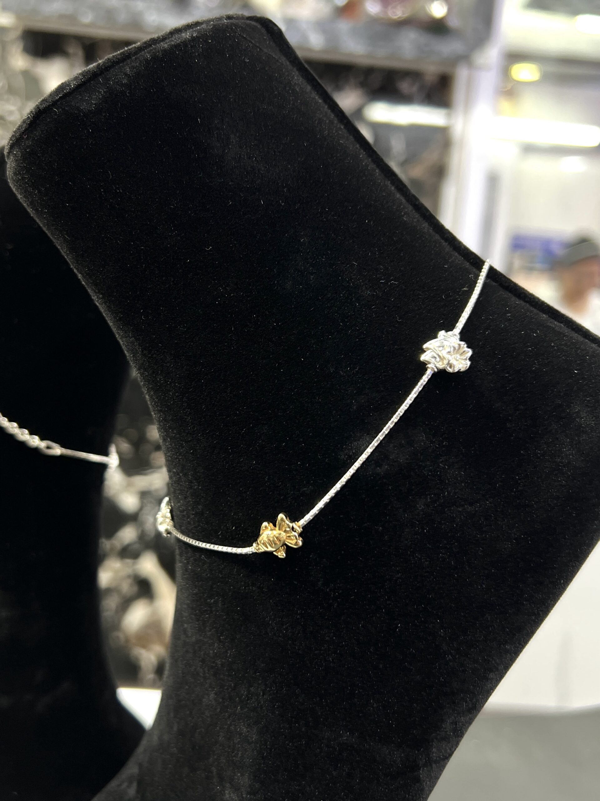 The Gilded Dragonfly 925 Silver Anklet This exquisite 925 silver anklet showcases a delicate golden dragonfly charm at its center, adding a touch of natural beauty and whimsy to your look. The fine silver chain is adorned with small, polished beads, creating a minimalist yet sophisticated design. With its adjustable fit, this anklet is a beautiful, eye-catching piece for any occasion.