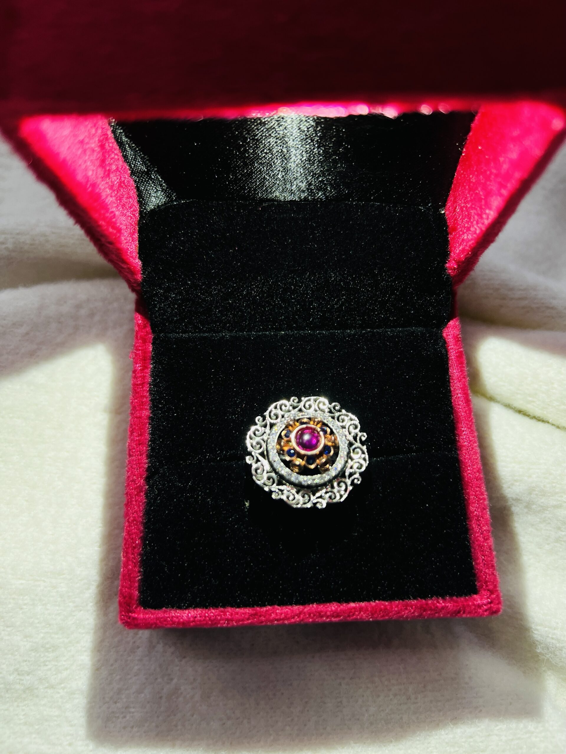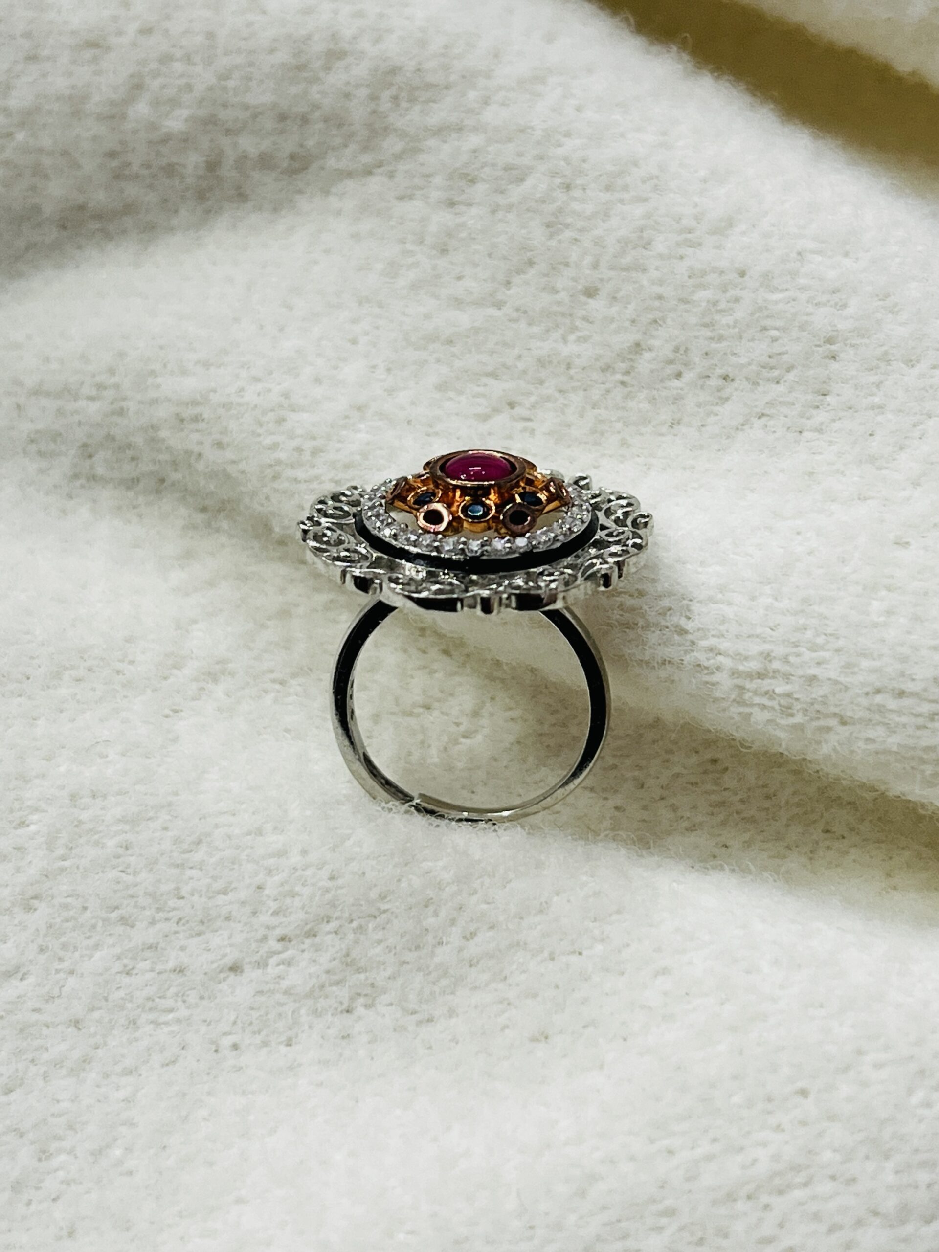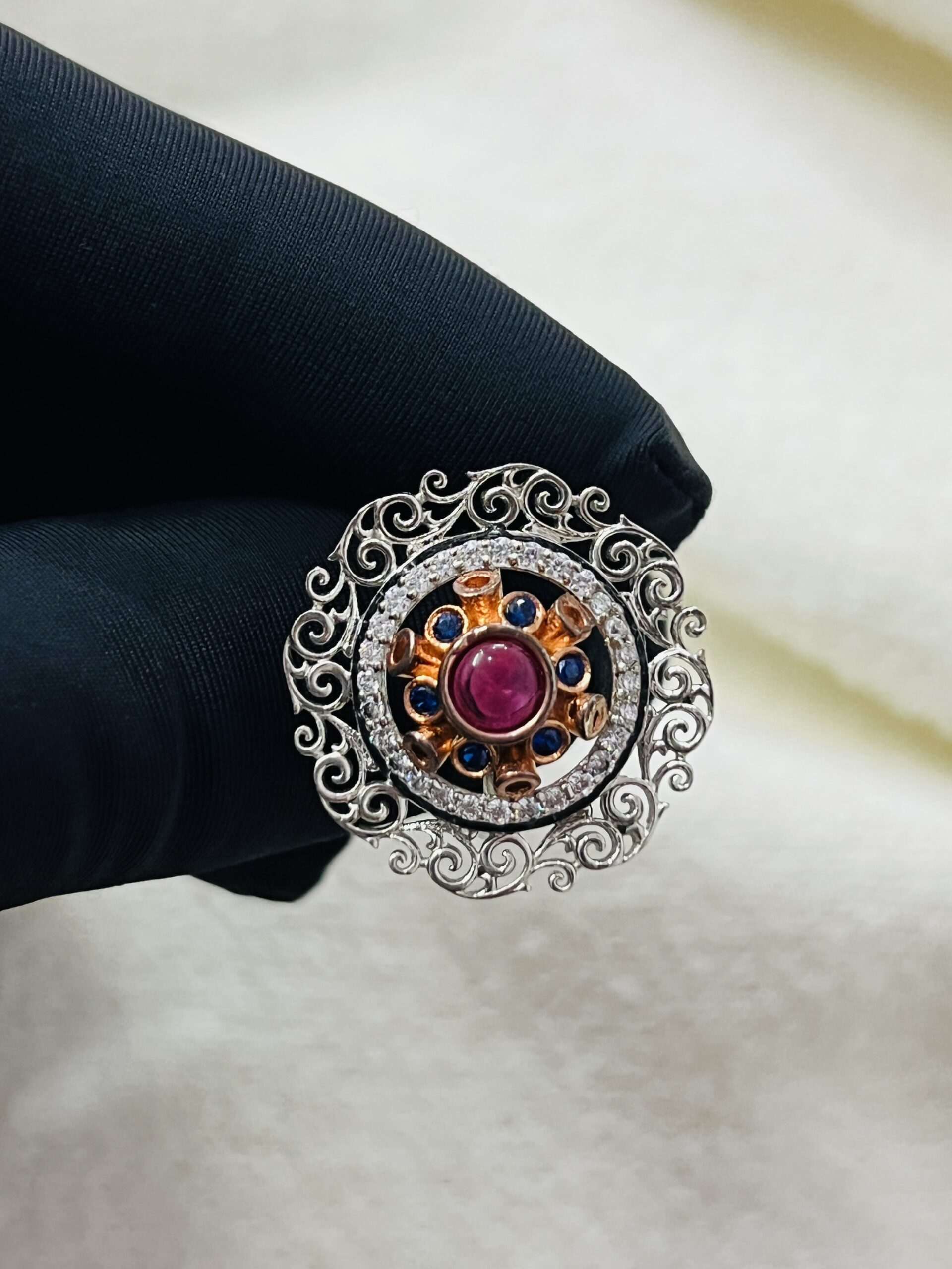 Vintage Bloom Sterling Silver Ring Adjustable This beautiful 925 sterling silver ring for women is a true statement piece. The large, intricate design features a central red gemstone surrounded by a halo of small, dark blue and white stones, which are all set in a rose-gold tone. The outer layer is a detailed sterling silver filigree pattern, inspired by vintage and floral motifs. This ring combines elegant craftsmanship with a bold mix of colors and textures, making it a perfect accessory for special occasions.