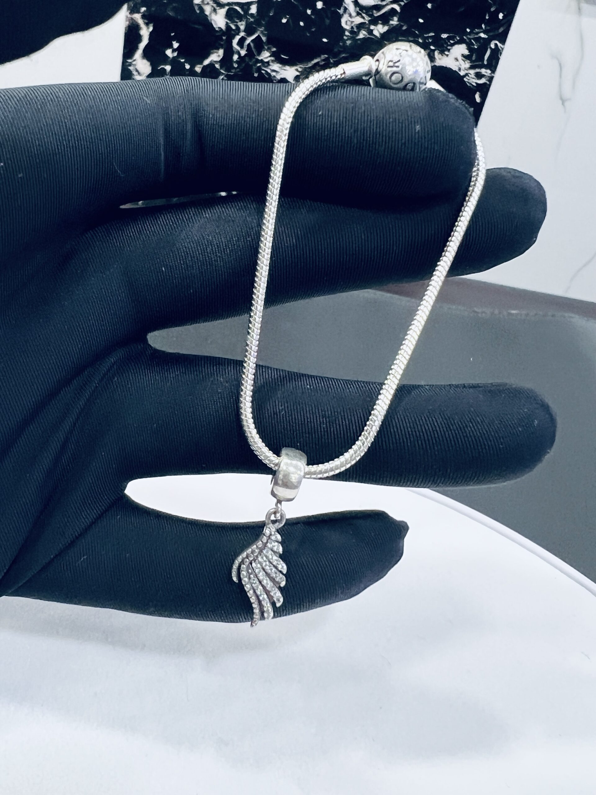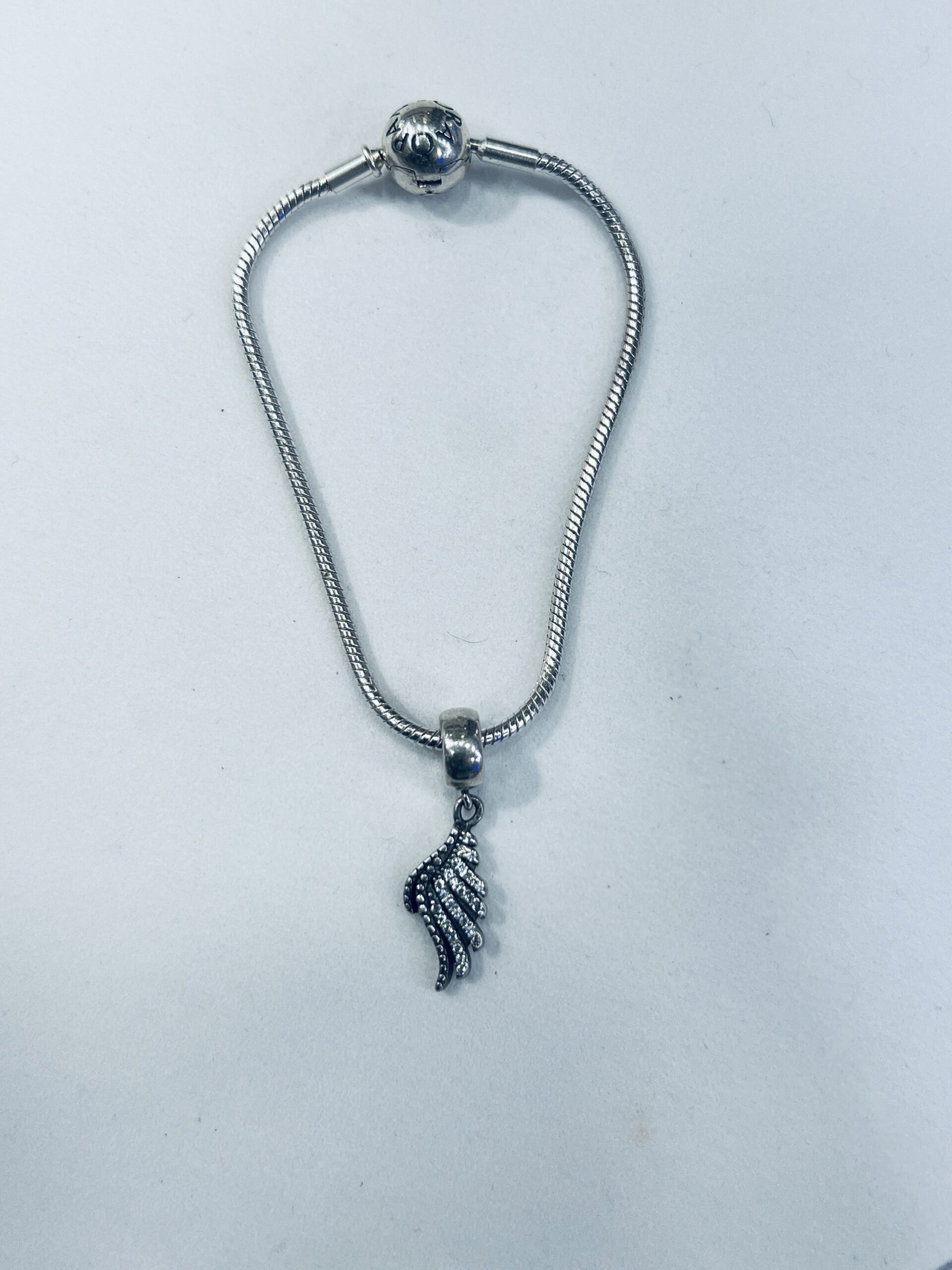 Winged Charm 925 Silver Bracelet This elegant charm bracelet is a perfect blend of delicate beauty and timeless style. It features a classic snake chain with a single, intricate wing charm that hangs gracefully from the center. The detailed wing is adorned with sparkling cubic zirconia stones, adding a touch of shimmer and whimsy. This bracelet is a beautiful symbol of freedom and lightness, perfect for wearing on its own or as a special piece in a larger charm collection.